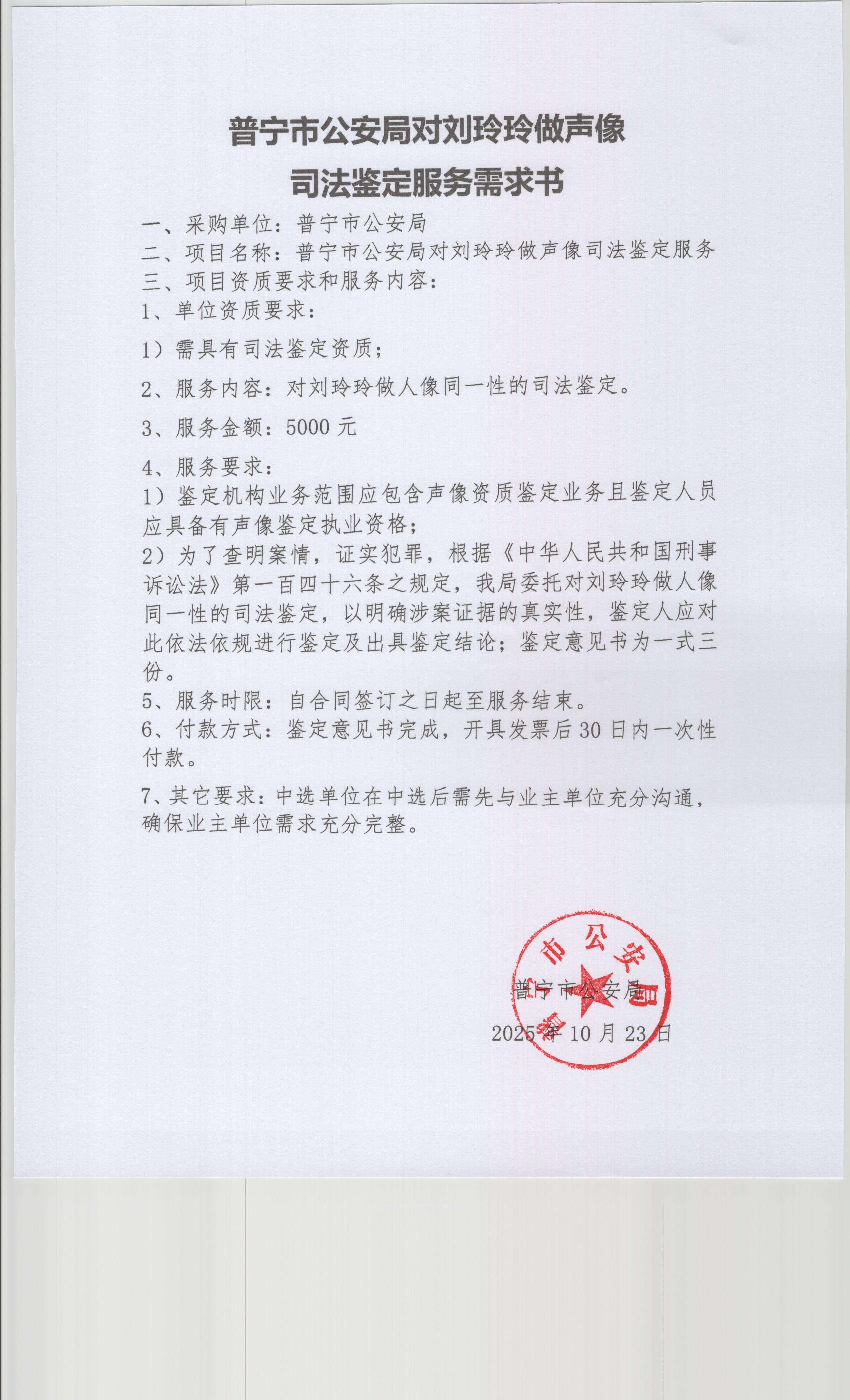 普宁市公安局对刘玲玲做声像司法鉴定服务采购公告