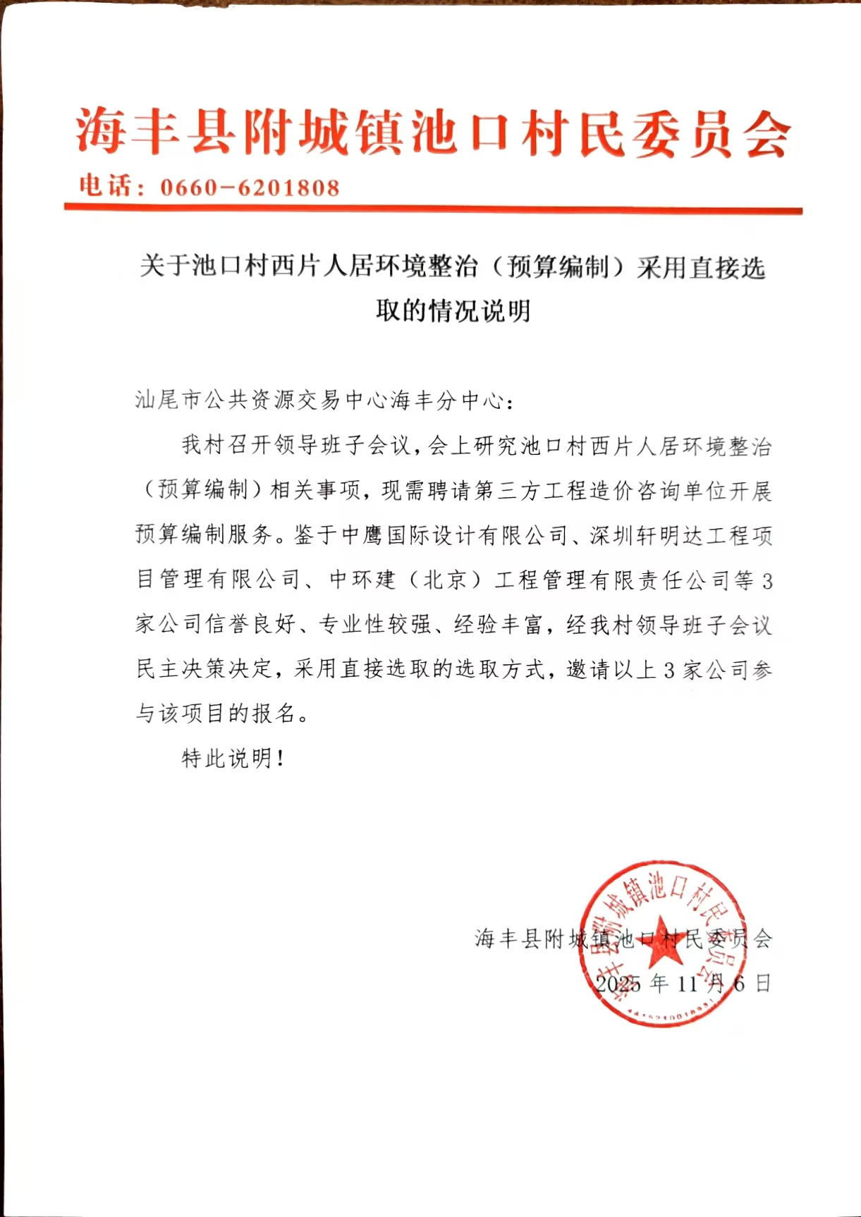 关于为【池口村西片人居环境整治(预算编制)】公开选取【工程造价咨询】机构的公告