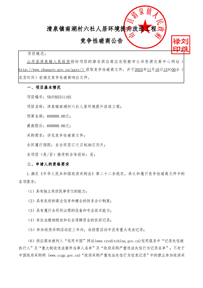 清泉镇南湖村六社人居环境提升改造工程竞争性磋商公告