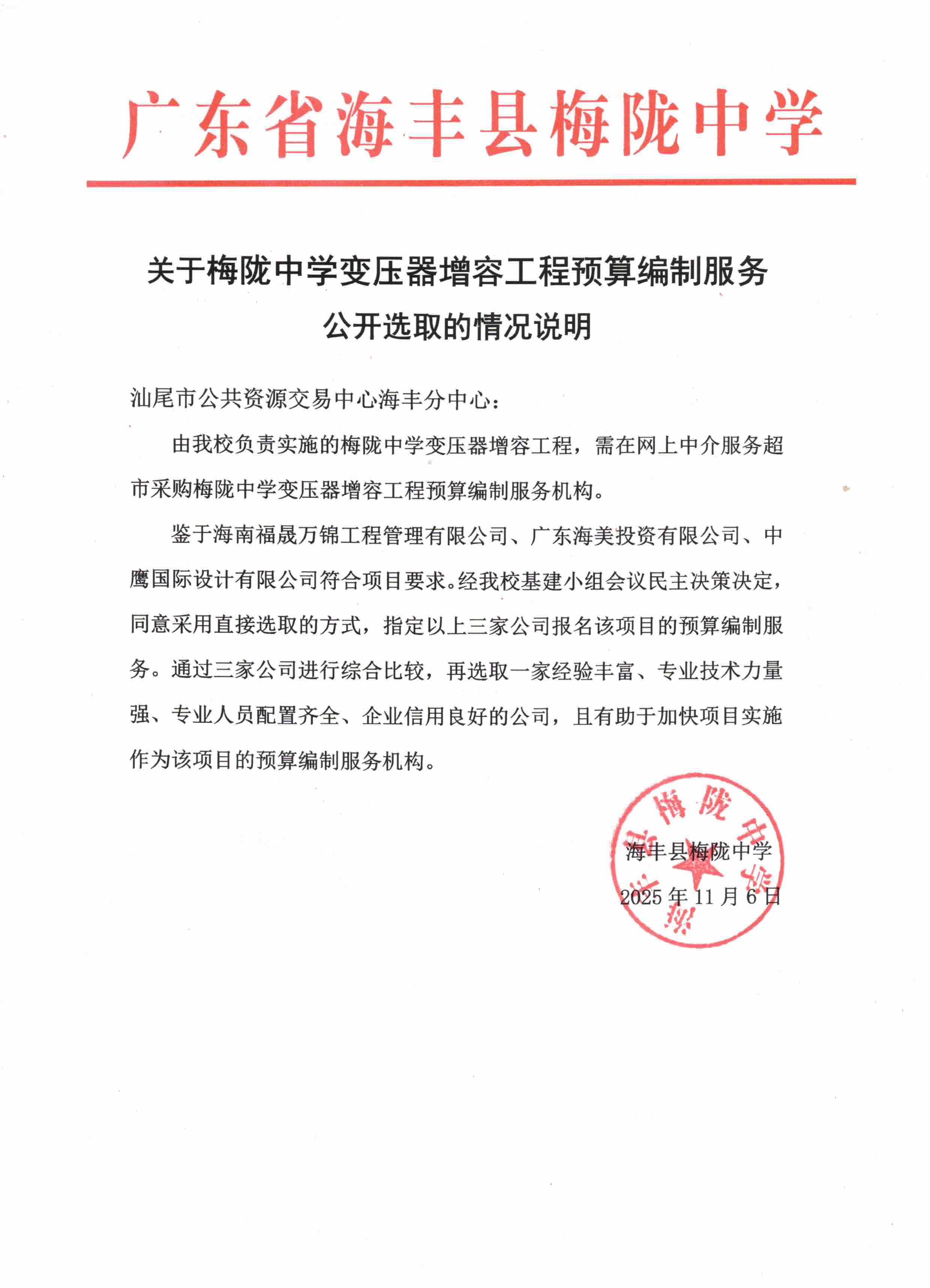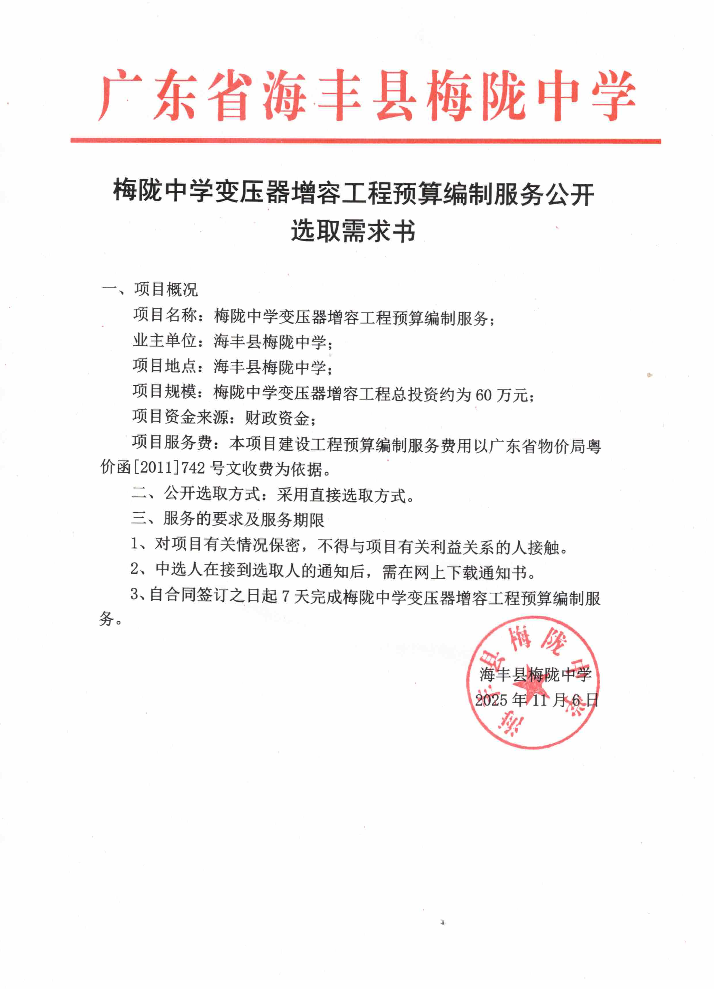 关于为【梅陇中学变压器增容工程预算编制服务】公开选取【工程造价咨询】机构的公告