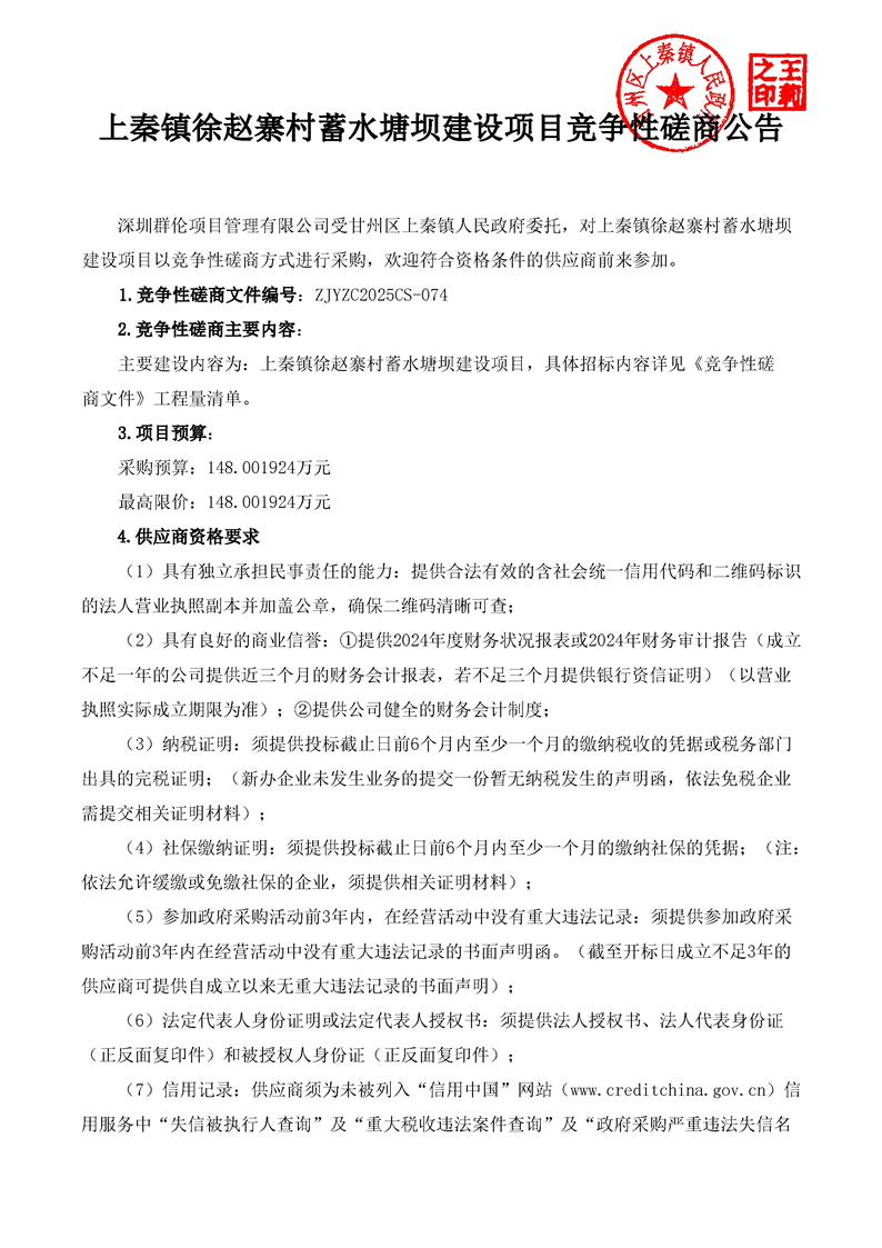 上秦镇徐赵寨村蓄水塘坝建设项目竞争性磋商公告采购/资审公告