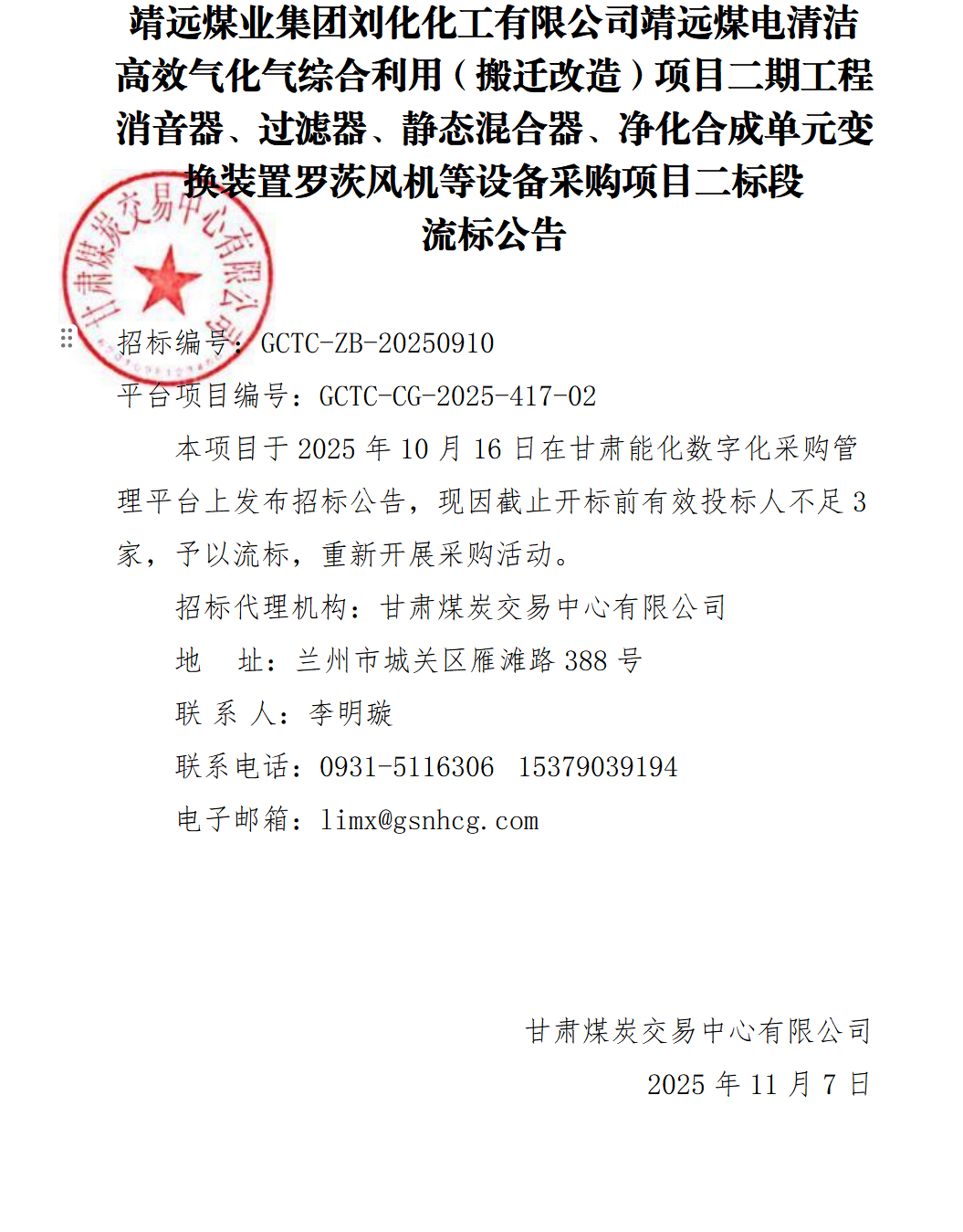 [公开招标]靖远煤业集团刘化化工有限公司靖远煤电清洁高效气化气综合利用(搬迁改造)项目二期工程消音器、过滤器、静态混合器、净化合成单元变换装置罗茨风机等设备采购项目二标段