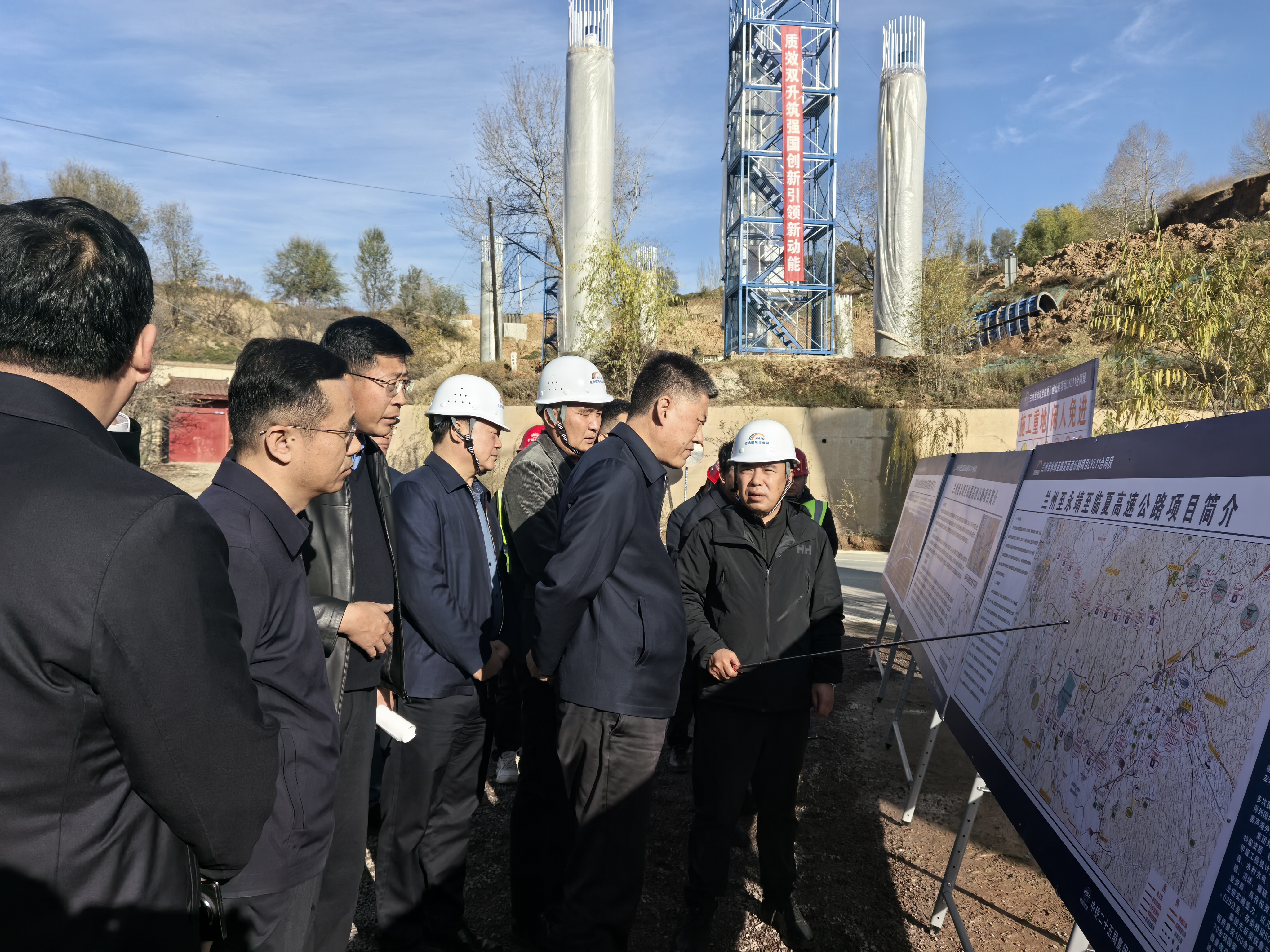 李海默一行深入兰永临高速公路项目东乡互通立交施工现场,听取了项目公司关于工程进度、征地拆迁、质量安全管控等方面的情况汇报,对项目建设取得的阶段性成效予以肯定。