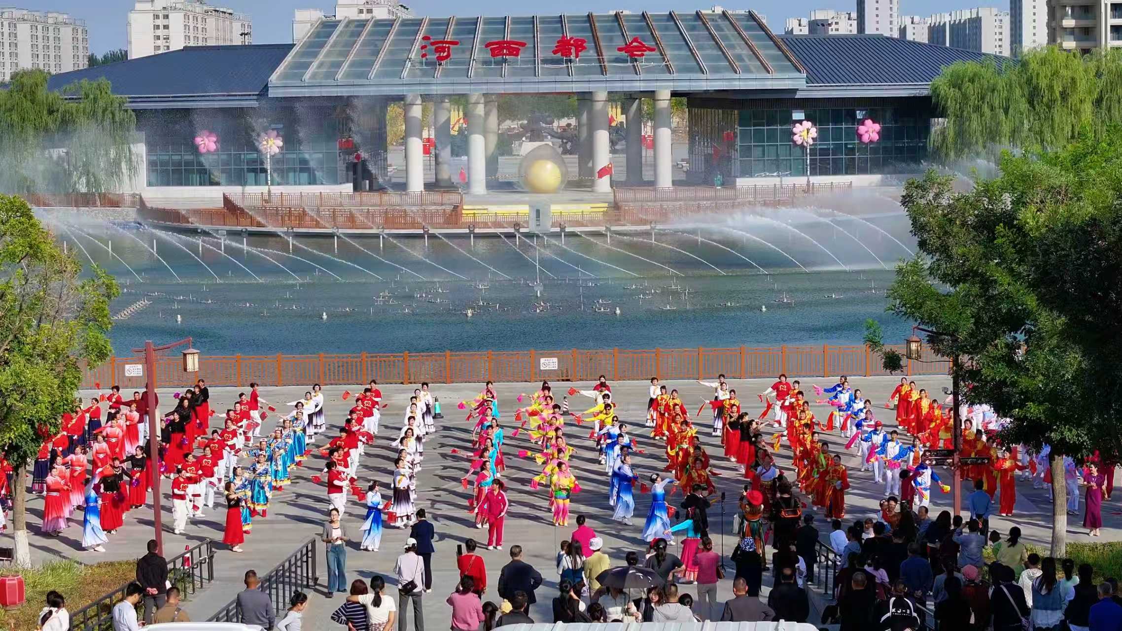 锦绣金秋,华章绽放。**月*日,为热烈庆祝中华人民共和国成立**周年,并喜迎传统中秋佳节,“共贺盛世华章·月满河西都会”国庆中秋双节同庆系列活动在河西都会景区隆重拉开帷幕。当日,多项精彩活动接连上演,吸引大量市民游客齐聚于此,共贺国泰民安,同享团圆喜悦。