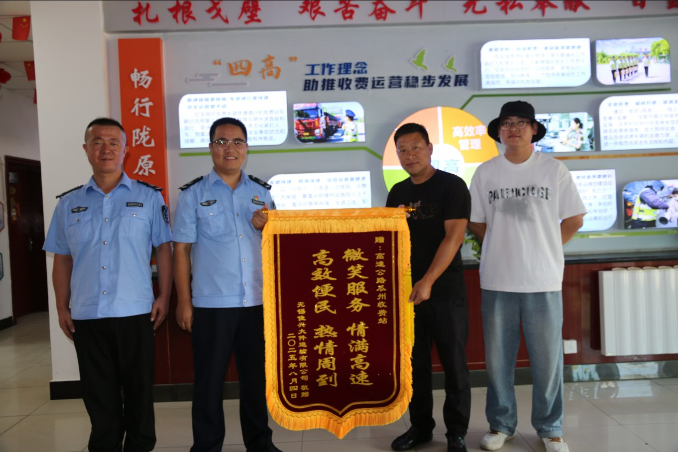 “我是专程来给你们送锦旗的,感谢你们能够积极主动地协调,帮助我们顺利完成****套风电塔筒的运输任务,你们的业务能力让我们由衷地为你们点赞!”*月*日,佳兴大件运输公司专程到瓜州收费站送锦旗,旗上写着“微笑服务 情满高速 高效便民 热情周到”,感谢工作人员积极协调,助其顺利完成****套风电塔筒运输任务。今年以来,面对年度千余套风电塔筒运输挑战,瓜州收费站主动出击,积极协调企业,采用“预约+错峰+保障”模式,为大件运输车辆提供“一对一”专属服务。在车流平缓时开辟专用通道,确保车辆即到即检、快速通行。同时,推行预约通行机制,让运输公司提前告知关键信息,收费站主动对接,制定个性化通行方案,变“被动等待”为“主动服务”。