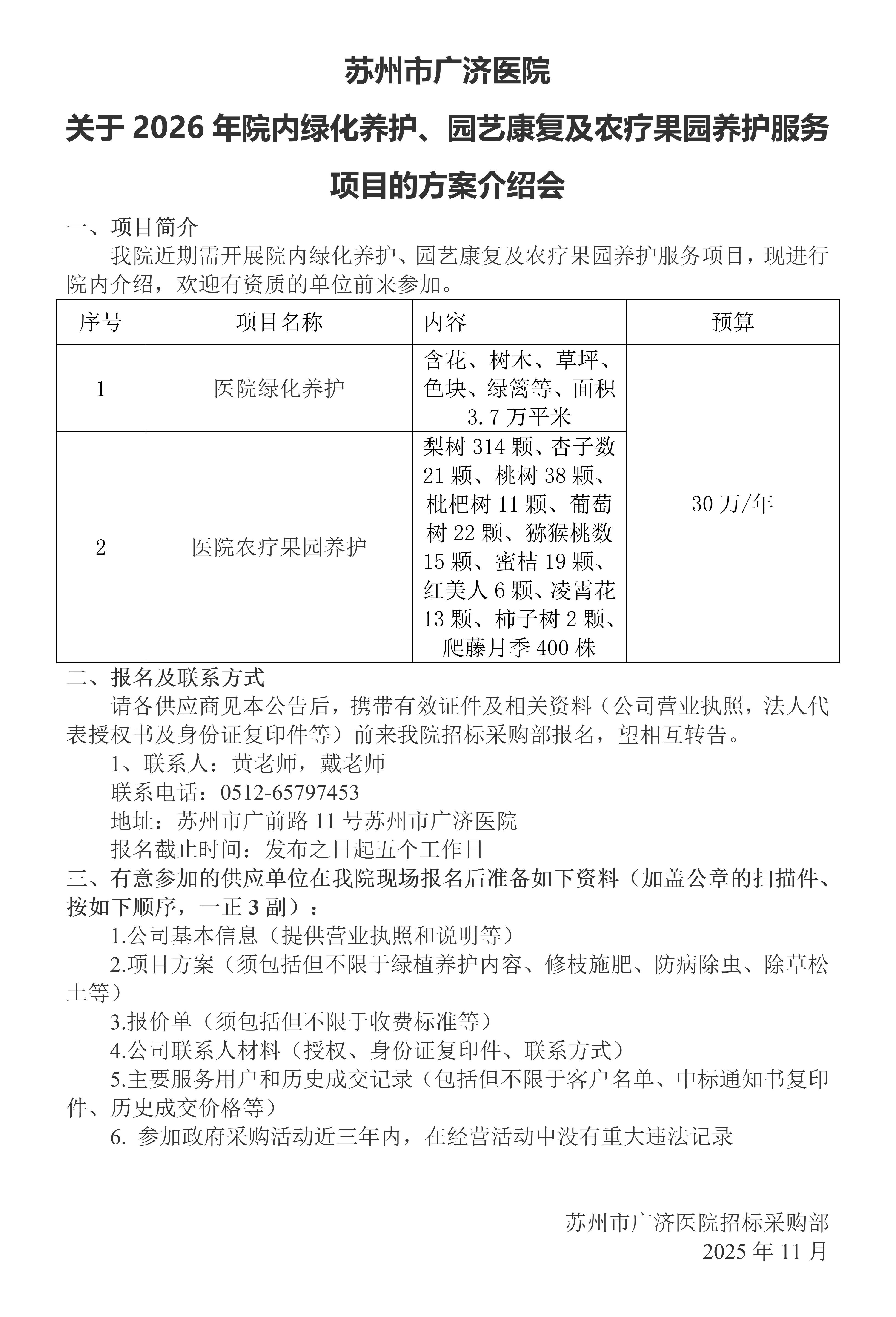 苏州市广济医院关于2026年院内绿化养护、园艺康复及农疗果园养护服务项目的方案介绍会