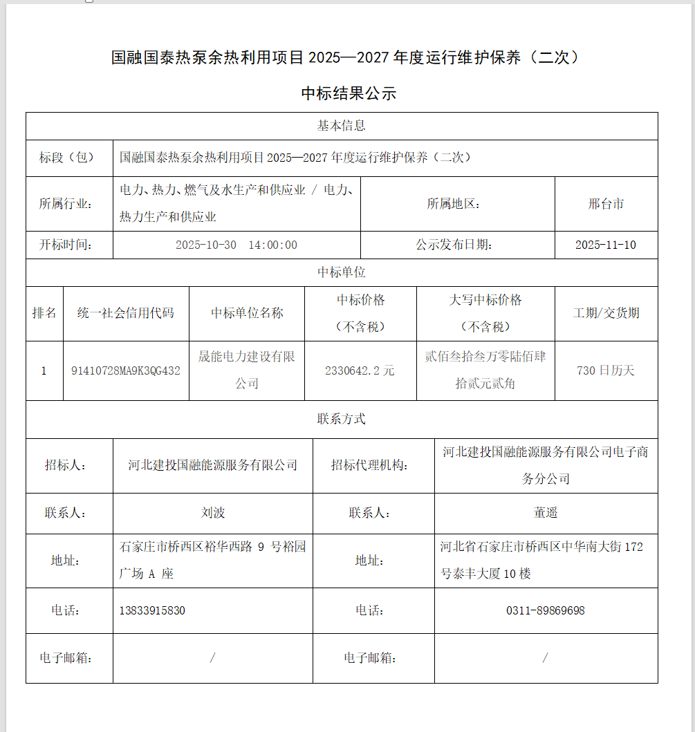 【正常】国融国泰热泵余热利用项目2025—2027年度运行维护保养(二次)中标公告