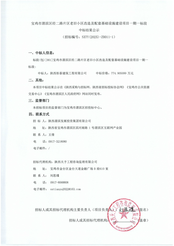宝鸡市渭滨区经二路片区老旧小区改造及配套基础设施建设项目一期一标段中标结果公示
