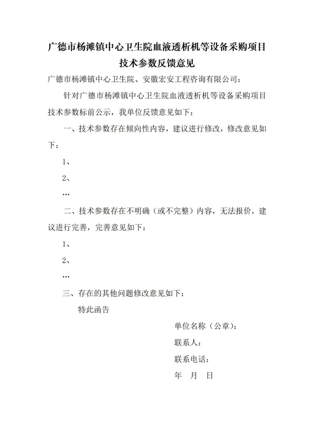 如对本项目技术参数有不同意见,请您于****年**月**日**时前,将反馈意见(格式详见附件:反馈意见书)和相关证明文件(包括技术标准、产品彩页、检测报告等)加盖公章后发送扫描件至邮箱或送达采购人(采购代理机构)。