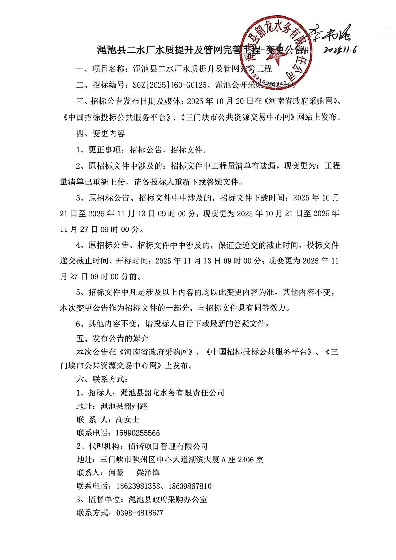 渑池县韶龙水务有限责任公司渑池县二水厂水质提升及管网完善工程项目-变更公告