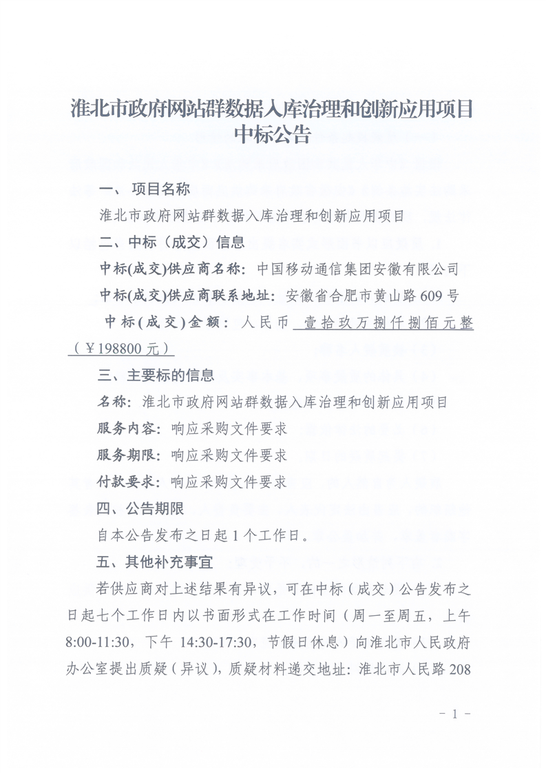 淮北市政府网站群数据入库治理和创新应用项目中标公告