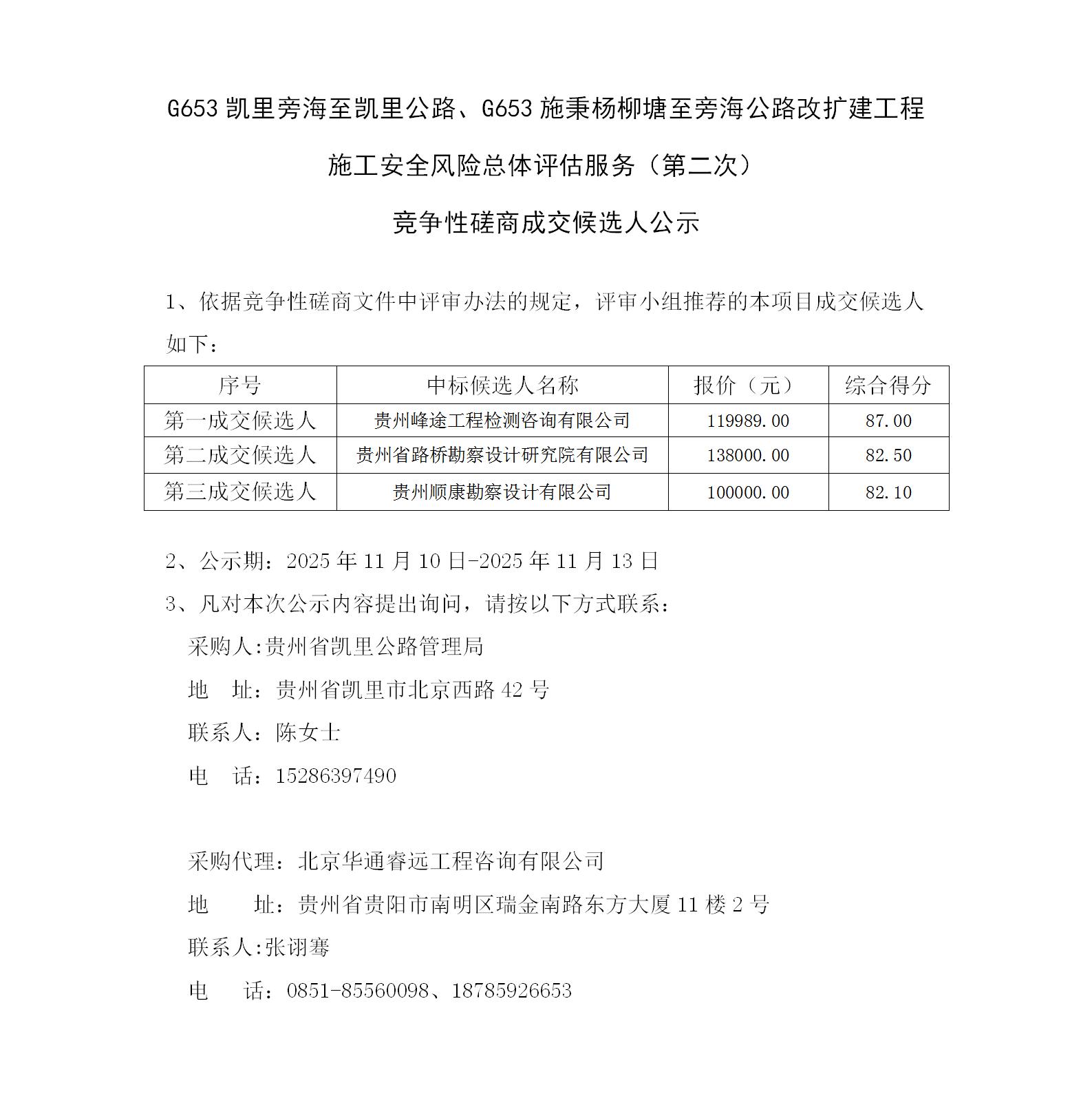 G653凯里旁海至凯里公路、G653施秉杨柳塘至旁海公路改扩建工程施工安全风险总体评估服务(第二次)竞争性磋商成交候选人公示