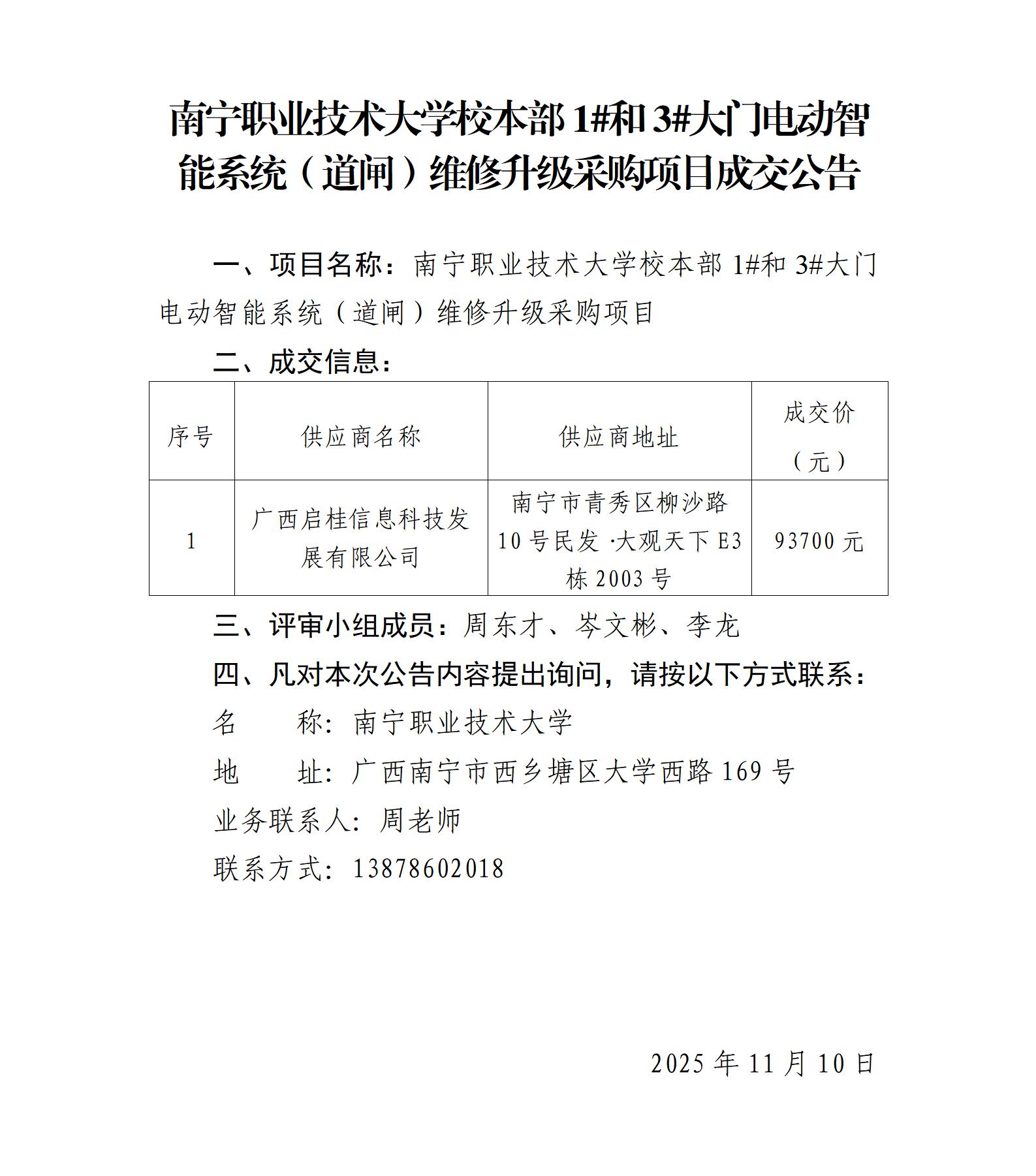 南宁职业技术大学校本部1#和3#大门电动智能系统(道闸)维修升级采购项目成交公告