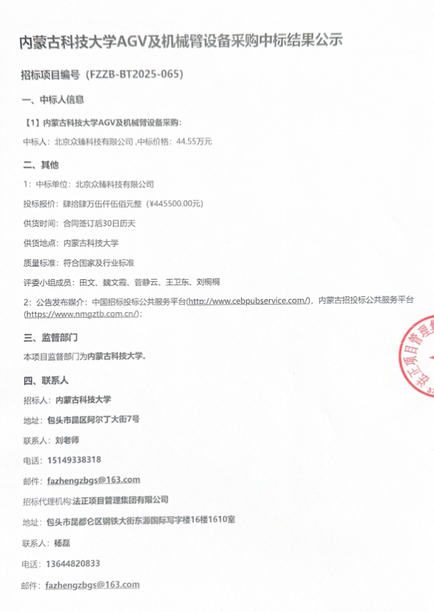 内蒙古科技大学AGV及机械臂设备采购中标结果公示