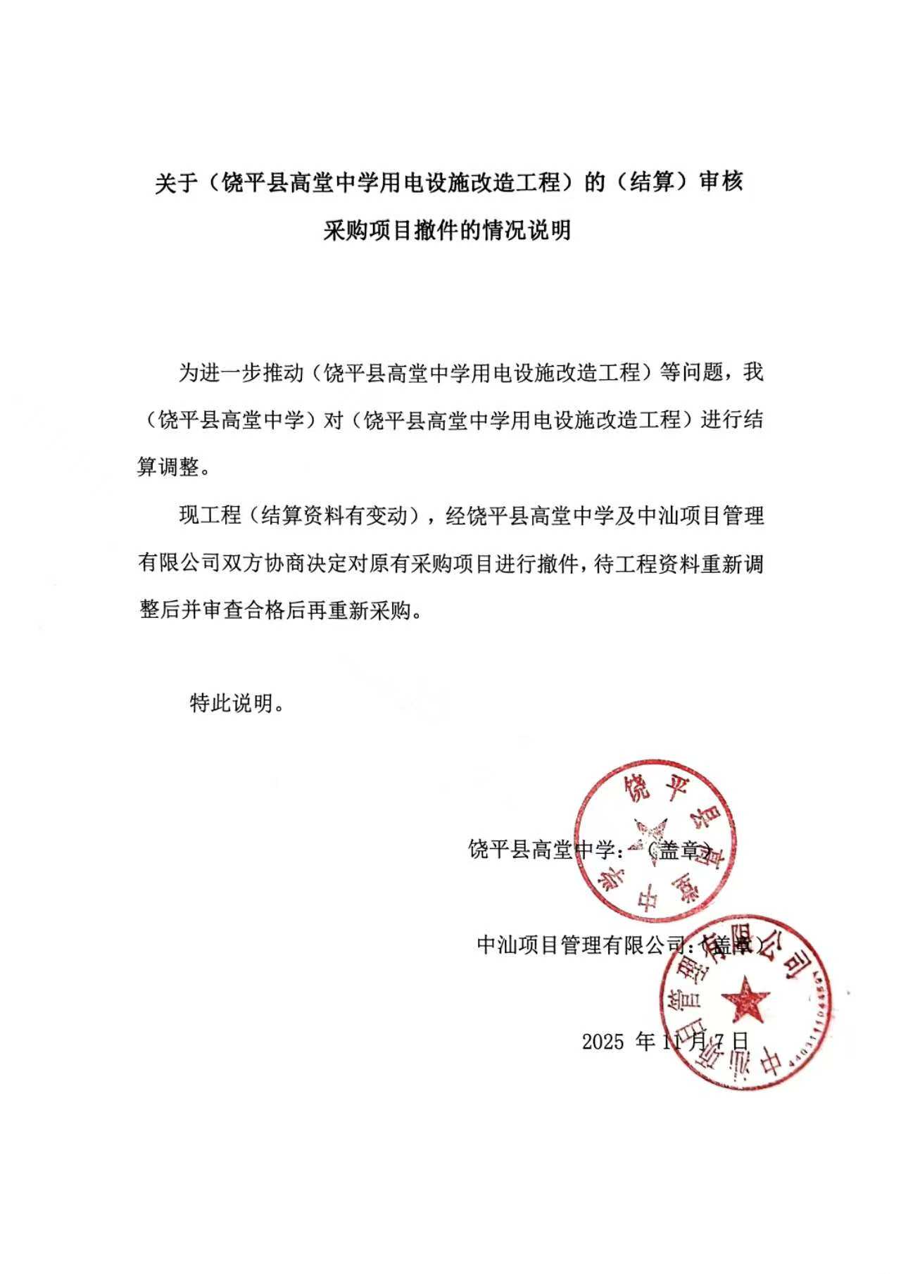 为进一步推动(饶平县高堂中学用电设施改造工程)等问题,我(饶平县高堂中学)对(饶平县高堂中学用电设施改造工程)进行结算调整。 现工程(结算资料有变动),经饶平县高堂中学及中汕项目管理有限公司双方协商决定对原有采购项目进行撤件,待工程资料重新调整后并审查合格后再重新采购