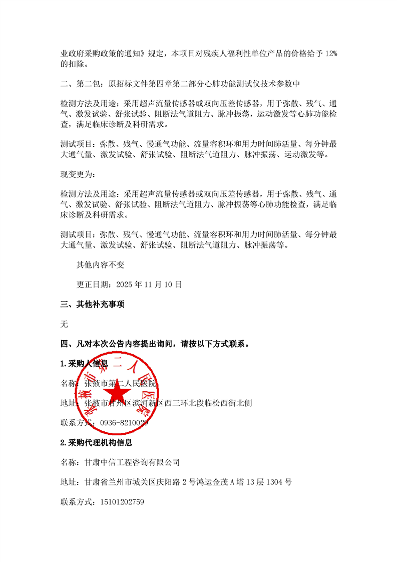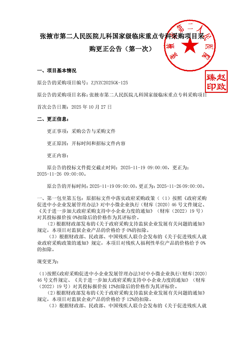 张掖市第二人民医院儿科国家级临床重点专科采购项目采购更正公告(第一次)