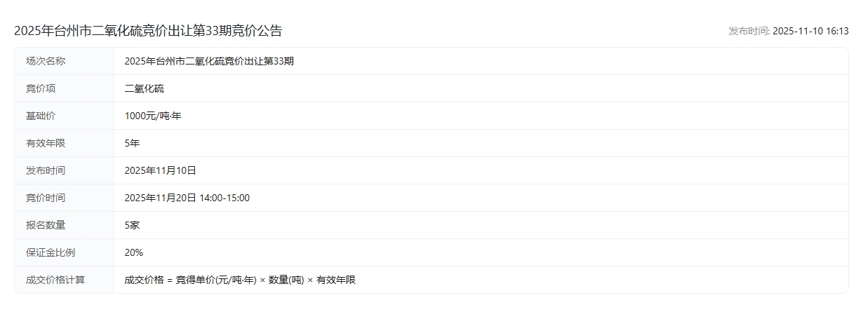 2025年台州市二氧化硫竞价出让第33期竞价公告