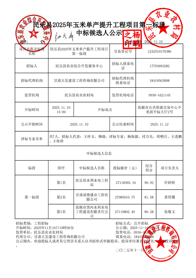 [市本级]民乐县2025年玉米单产提升工程项目第一标段中标候选人公示