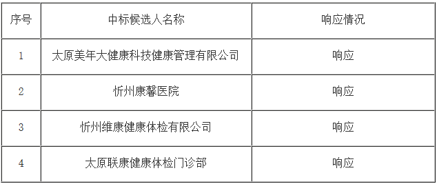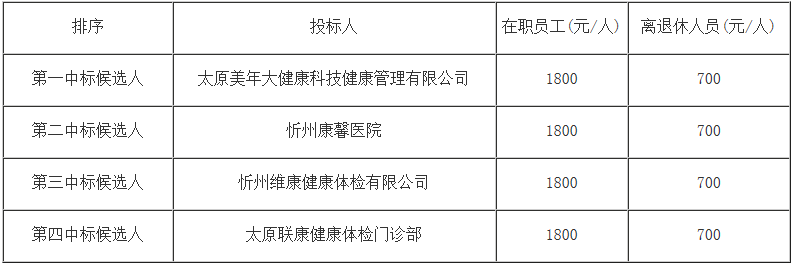 至投标文件递交截止时间,共有*家单位通过龙集采平台签到、解密投标文件,分别是:忻州维康健康体检有限公司、太原美年大健康科技健康管理有限公司、太原万邦有研健康体检中心有限公司、忻州康馨医院、太原联康健康体检门诊部;评标委员会按招标文件规定的评标办法及评审标准对通过初步评审的有效投标人进行详细评审并推荐以下中标候选人: