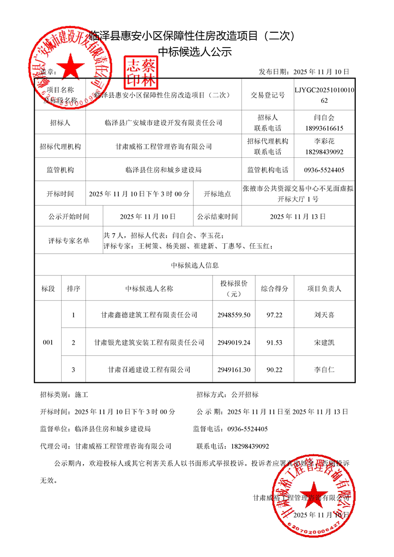 [临泽县]临泽县惠安小区保障性住房改造项目(二次)中标候选人公示