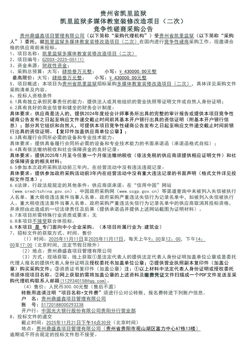 新闻资讯 贵州省凯里监狱多媒体教室装修改造项目(二次)竞争性磋商采购公告