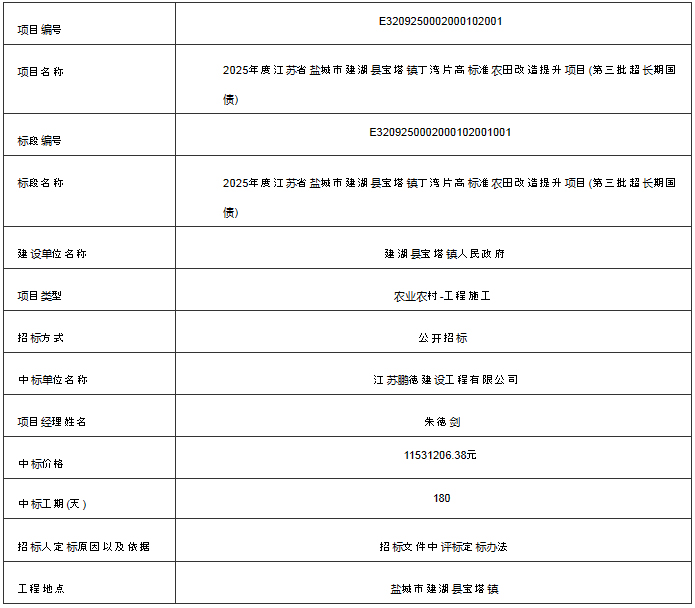 丁湾片高标准农田改造提升项目(第三批超长期国债)中标结果公告