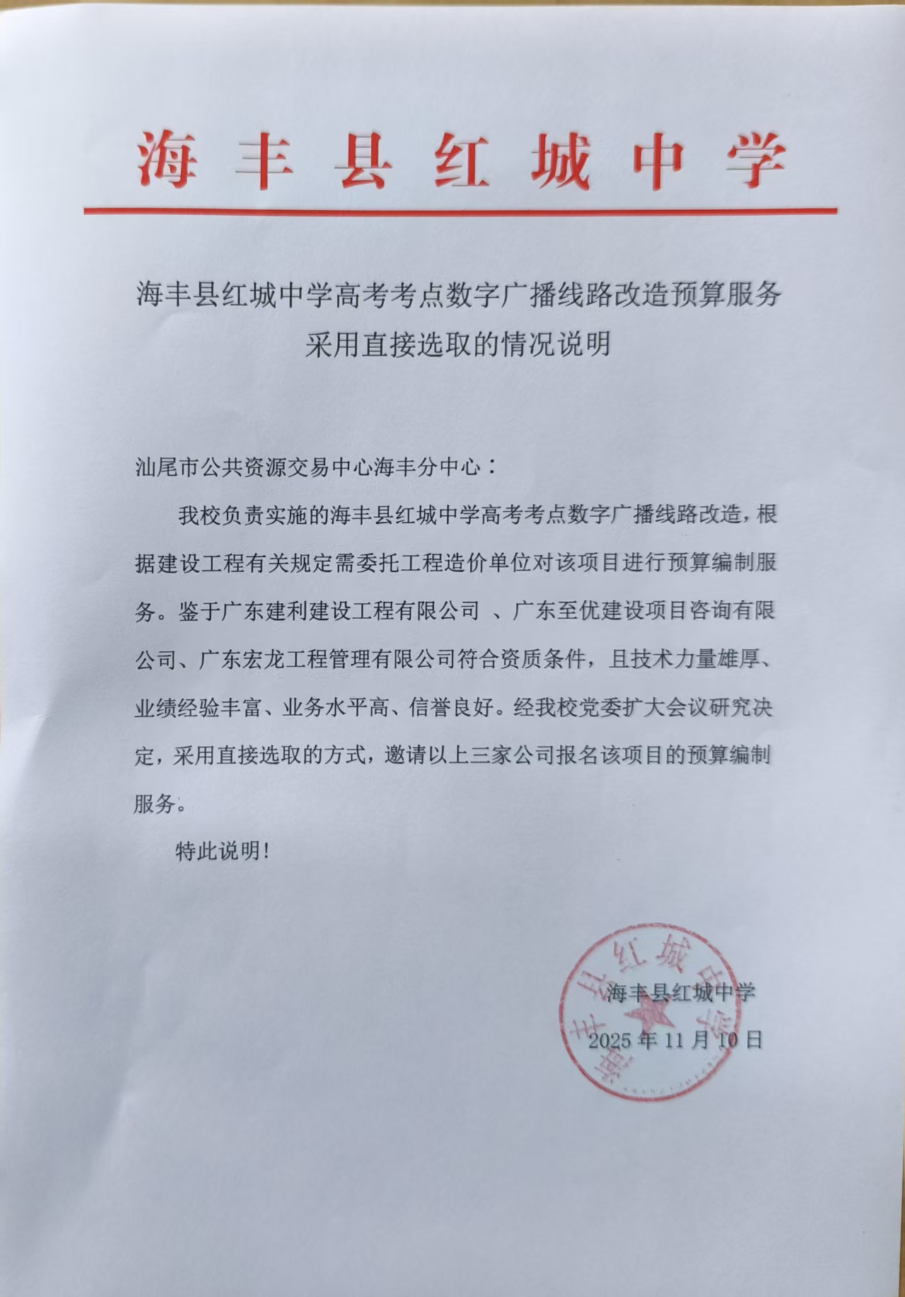 我校负责实施的海丰县红城中学高考考点数字广播线路改造,根据建设工程有关规定需委托工程造价单位对该项目进行预算编制服务。鉴于广东建利建设工程有限公司、广东至优建设项目咨询有限公司、广东宏龙工程管理有限公司符合资质条件,且技术力量雄厚、业绩经验丰富、业务水平高、信誉良好。经我校党委扩大会议研究决定,采用直接选取的方式,邀请以上三家公司报名该项目的预算编制服务。