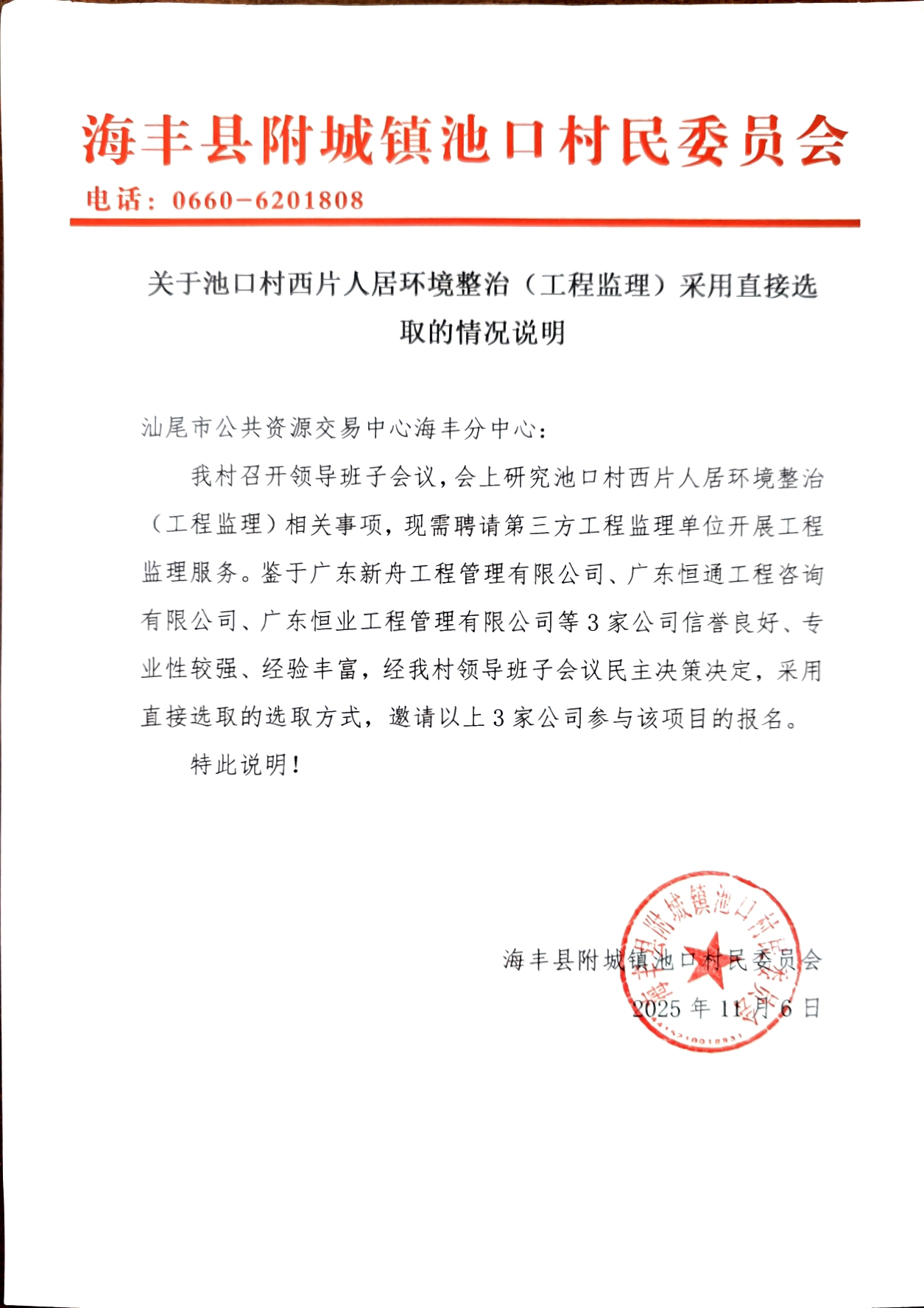 关于为【池口村西片人居环境整治(工程监理)】公开选取【工程监理】机构的公告