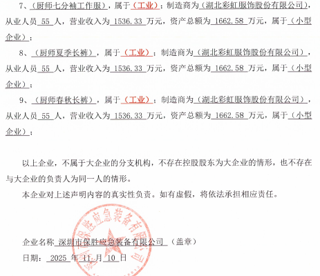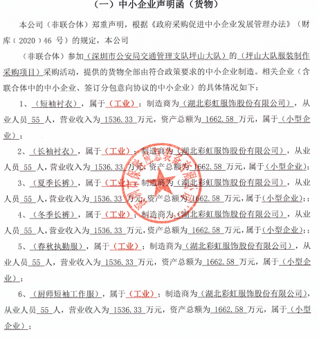 | * | 深圳市城升服饰有限公司 | *)营业执照(或事业单位法人证书)等证明资料复印件;*)法定代表人证明书;*)法定代表人授权书;*)政府采购投标及履约承诺函;*)招标代理服务费承诺书;*)投标报价;*)《供应商基本情况表》、社保缴纳证明材料、股权关系证明材料;*)落实政府采购政策需满足的资格要求:本项目属于专门面向工业中小企业采购的项目。 结论:资格核查通过。 | ¥***,***.** |