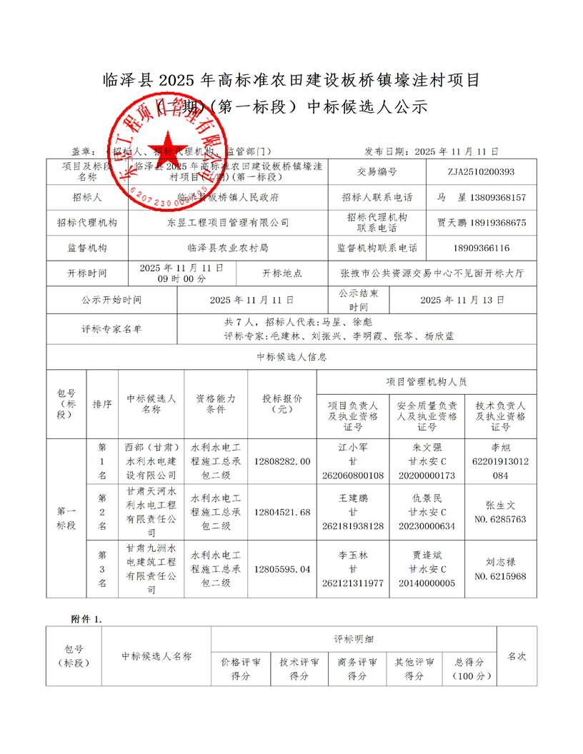 [市本级]临泽县2025年高标准农田建设板桥镇壕洼村项目(二期)(第一标段)中标候选人公示交易结果公示