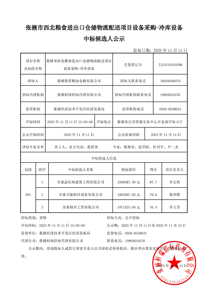 [市本级]张掖市西北粮食进出口仓储物流配送项目设备采购-冷库设备中标候选人公示交易结果公示