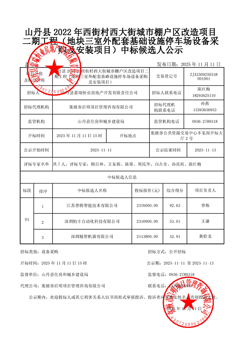 [市本级]山丹县2022年西街村西大街城市棚户区改造项目二期工程(地块三室外配套基础设施停车场设备采购及安装项目)中标候选人公示