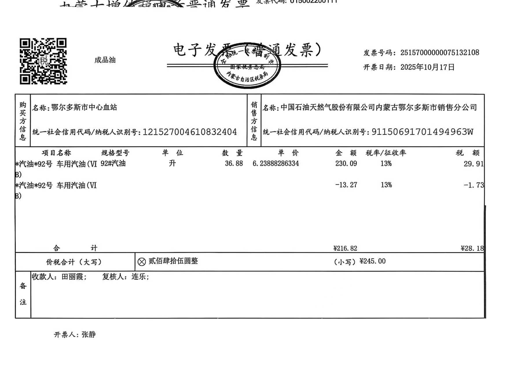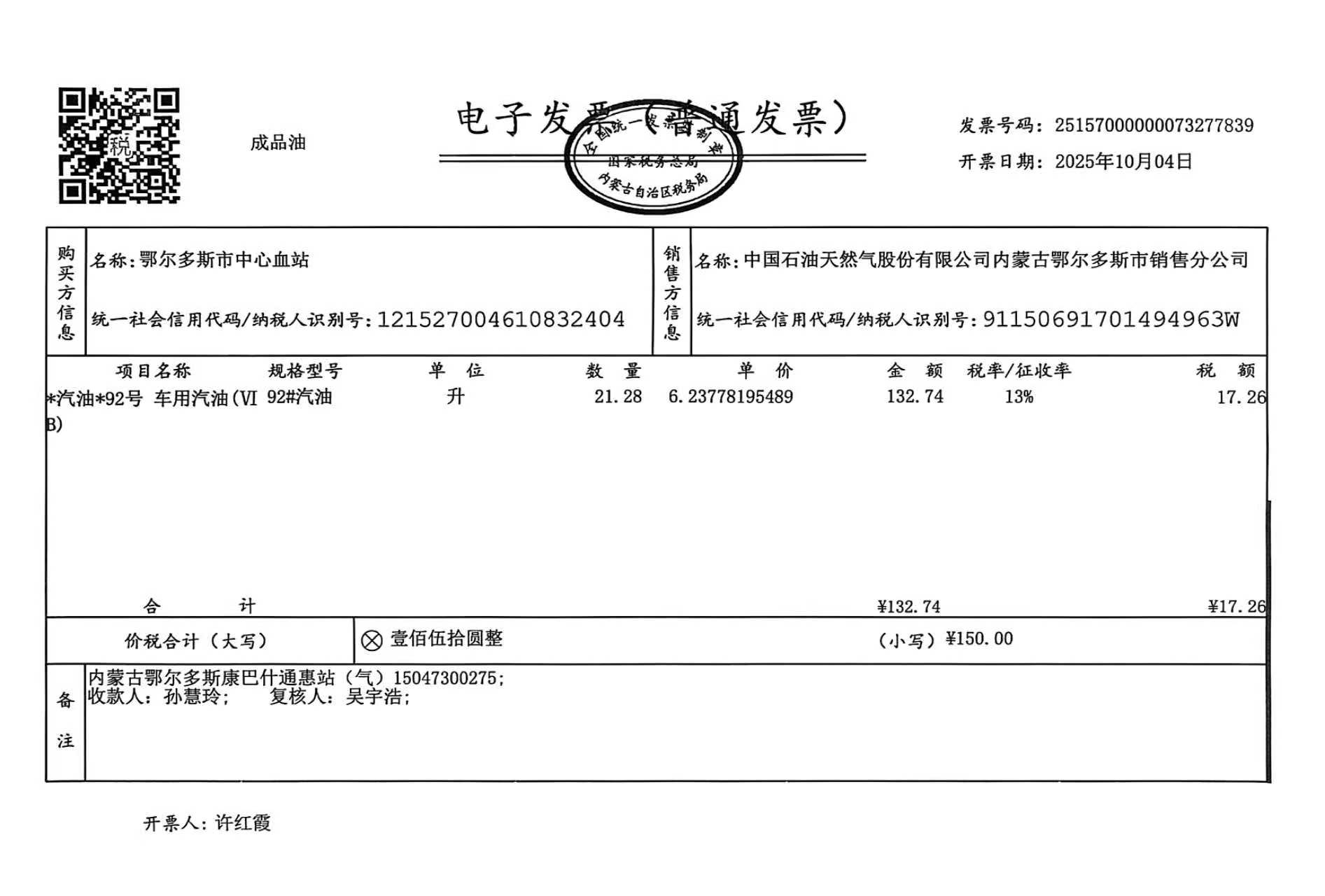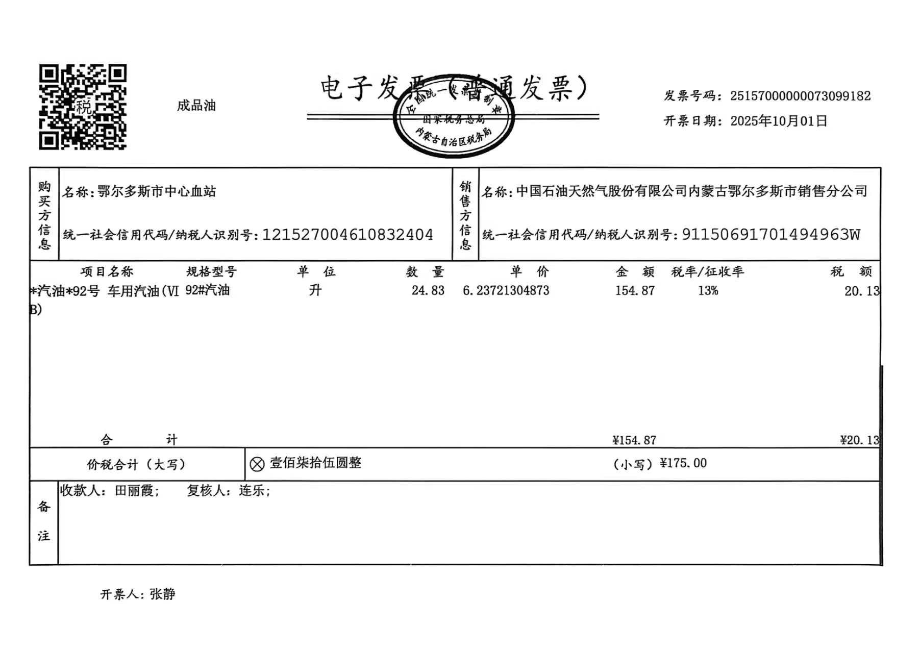 鄂尔多斯市中心血站蒙*******车辆十月用油政府采购合同公告