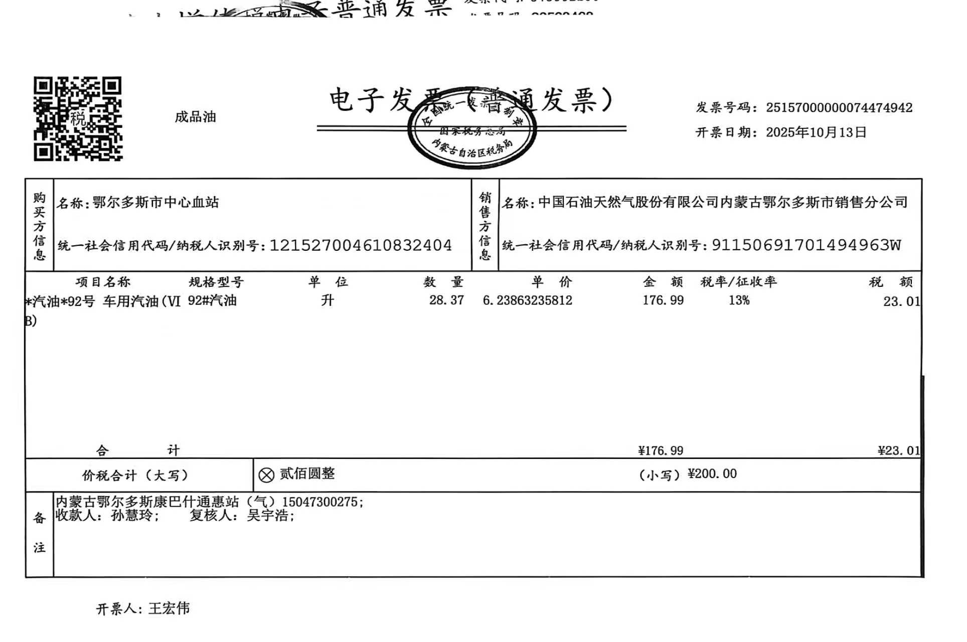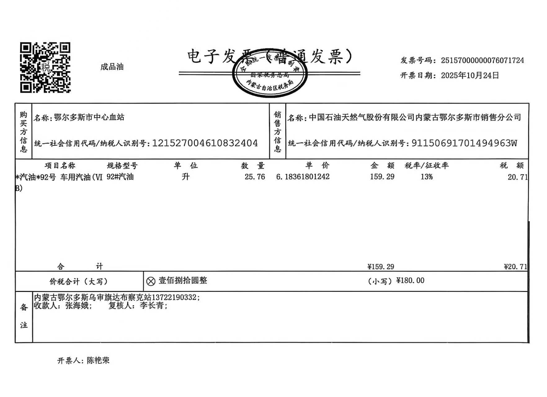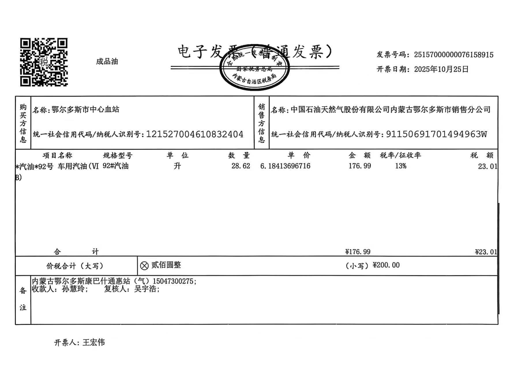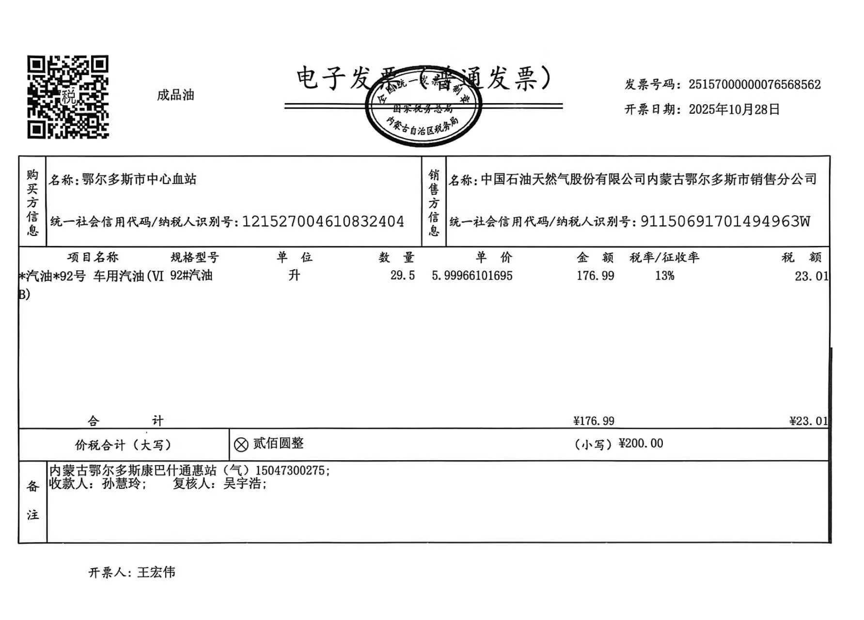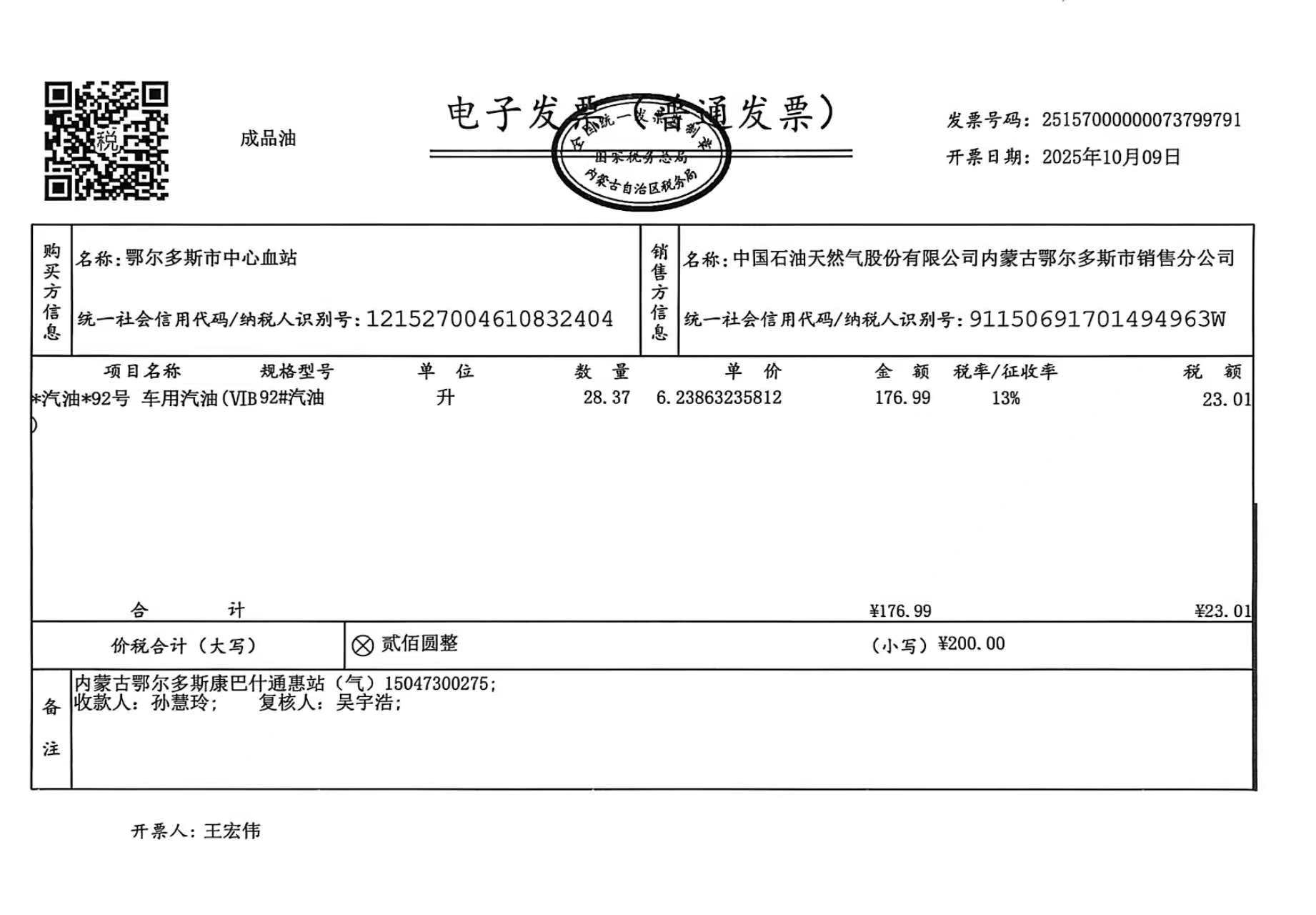 一、合同编号:***************(****)*********二、合同名称:蒙*******车辆十月用油三、项目编号:鄂财购备字(电子)[****]*****号四、项目名称:鄂尔多斯市中心血站车辆十月用油用电五、合同主体采购人(甲方):鄂尔多斯市中心血站 地址:康巴什区公共卫生大厦 联系方式:*********** 供应商(乙方):中国石油天然气股份有限公司内蒙古销售分公司 地址:内蒙古自治区呼和浩特市新城区成吉思汗大街 联系方式:************ 六、合同主要信息主要标的: