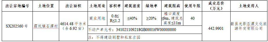 *****;*****;根据《招标拍卖挂牌出让国有建设用地使用权规定》,现将歙县国有建设用地使用权挂牌出让成交结果公示如下: