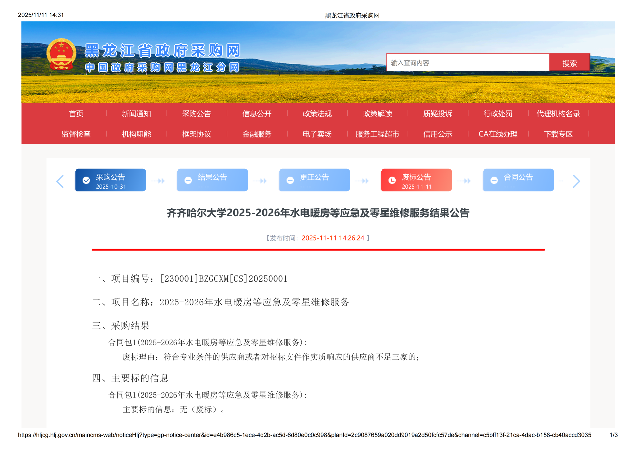 齐齐哈尔大学2025-2026年水电暖房等应急及零星维修服务结果公告(转自黑龙江省政府采购网)