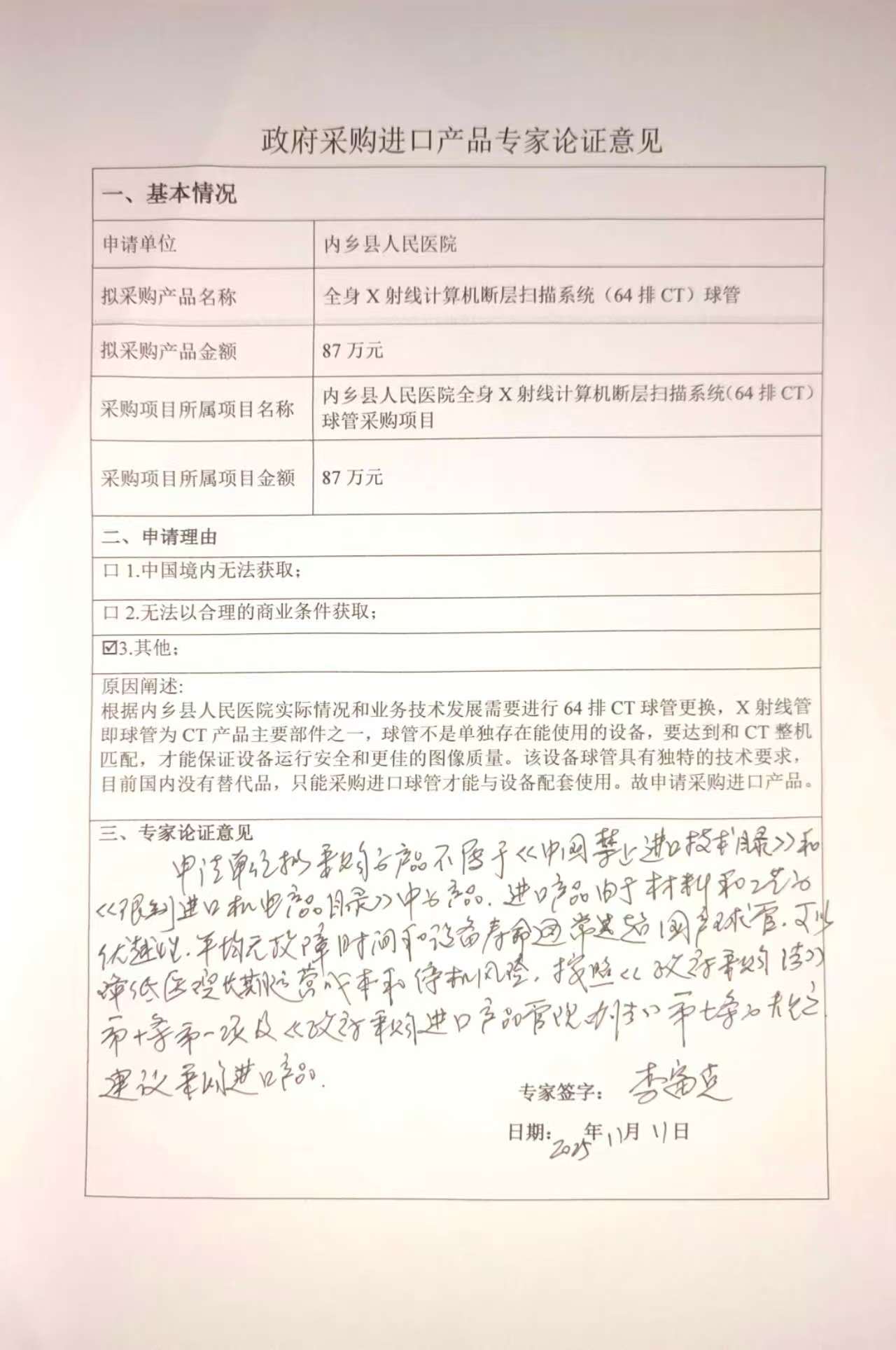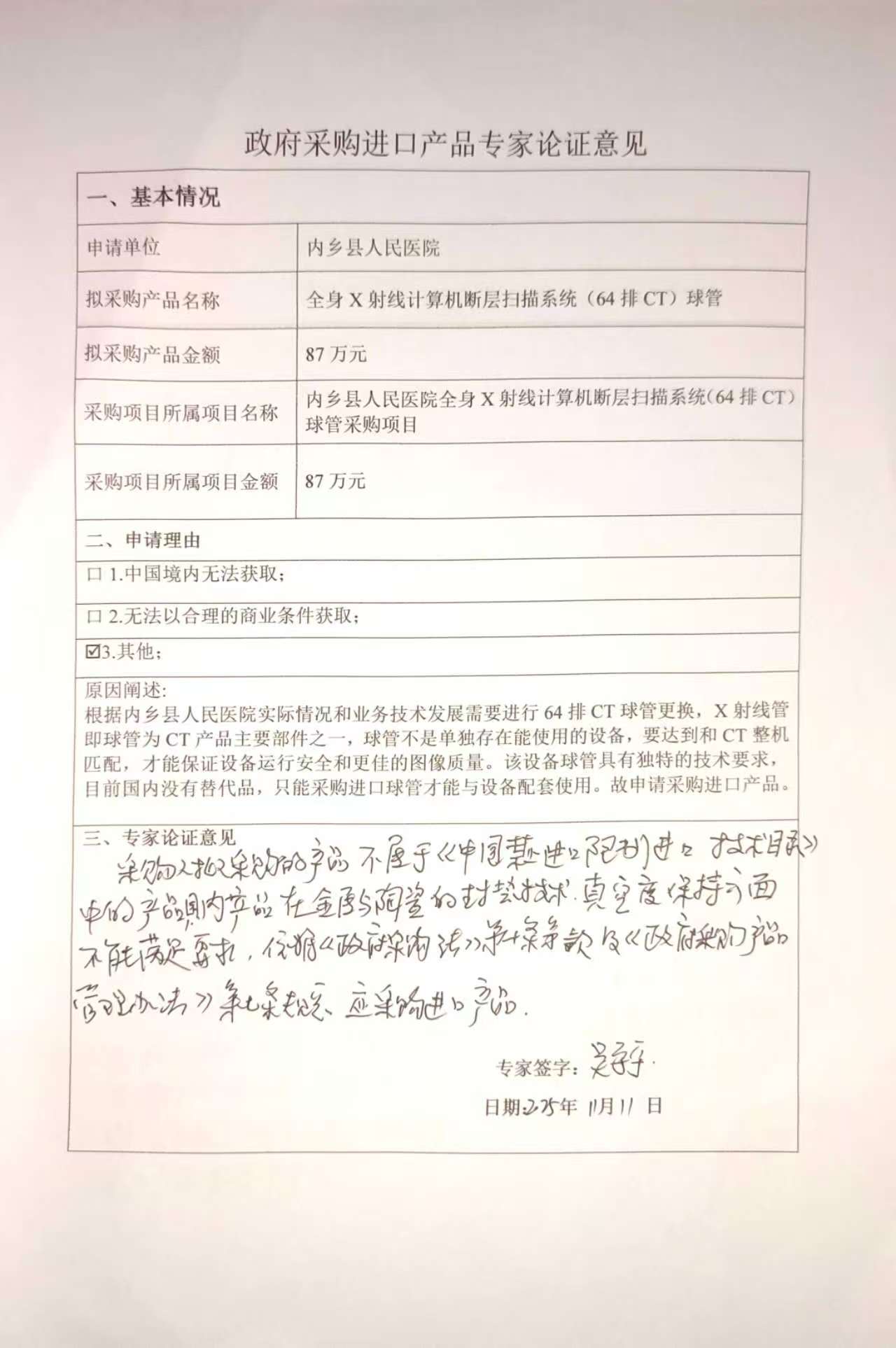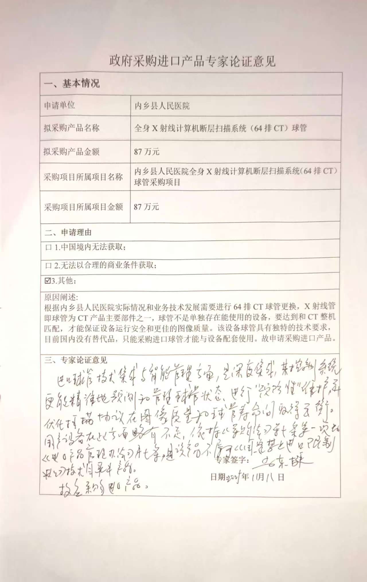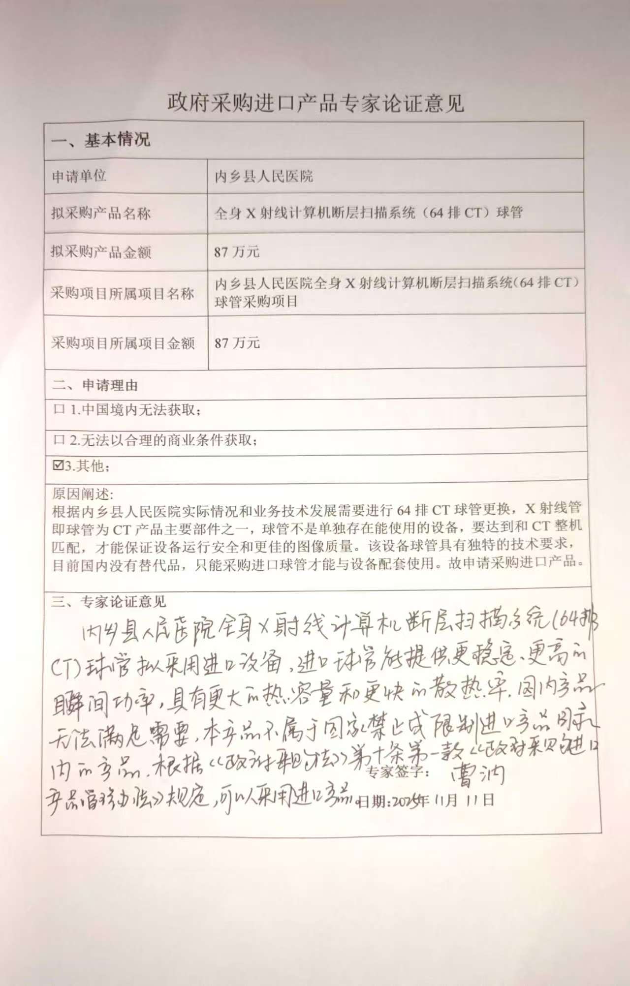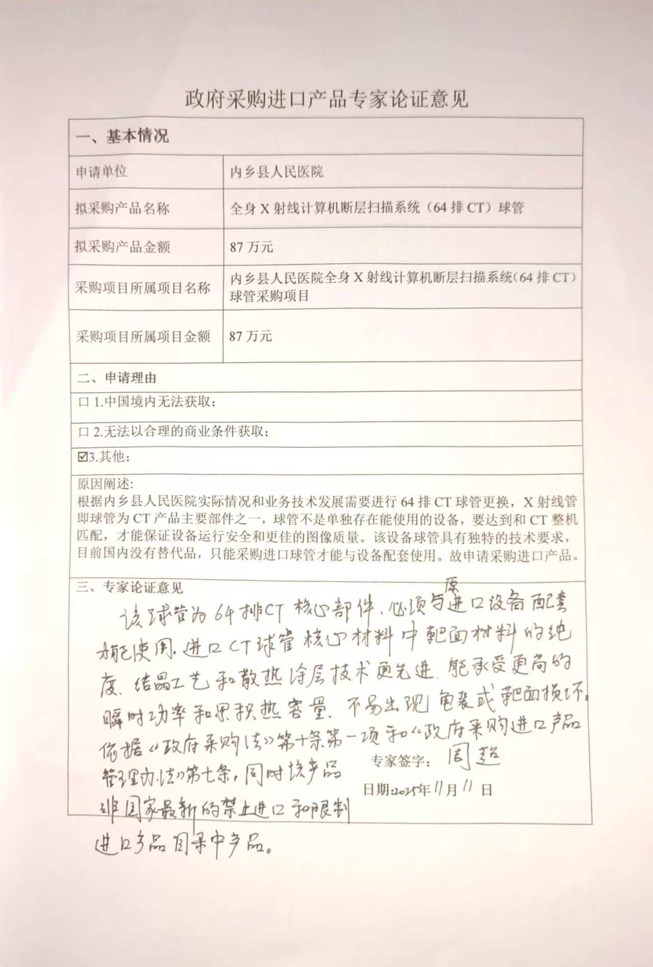 内乡县人民医院全身*射线计算机断层扫描系统(**排**)球管采购项目采购进口产品论证意见公示