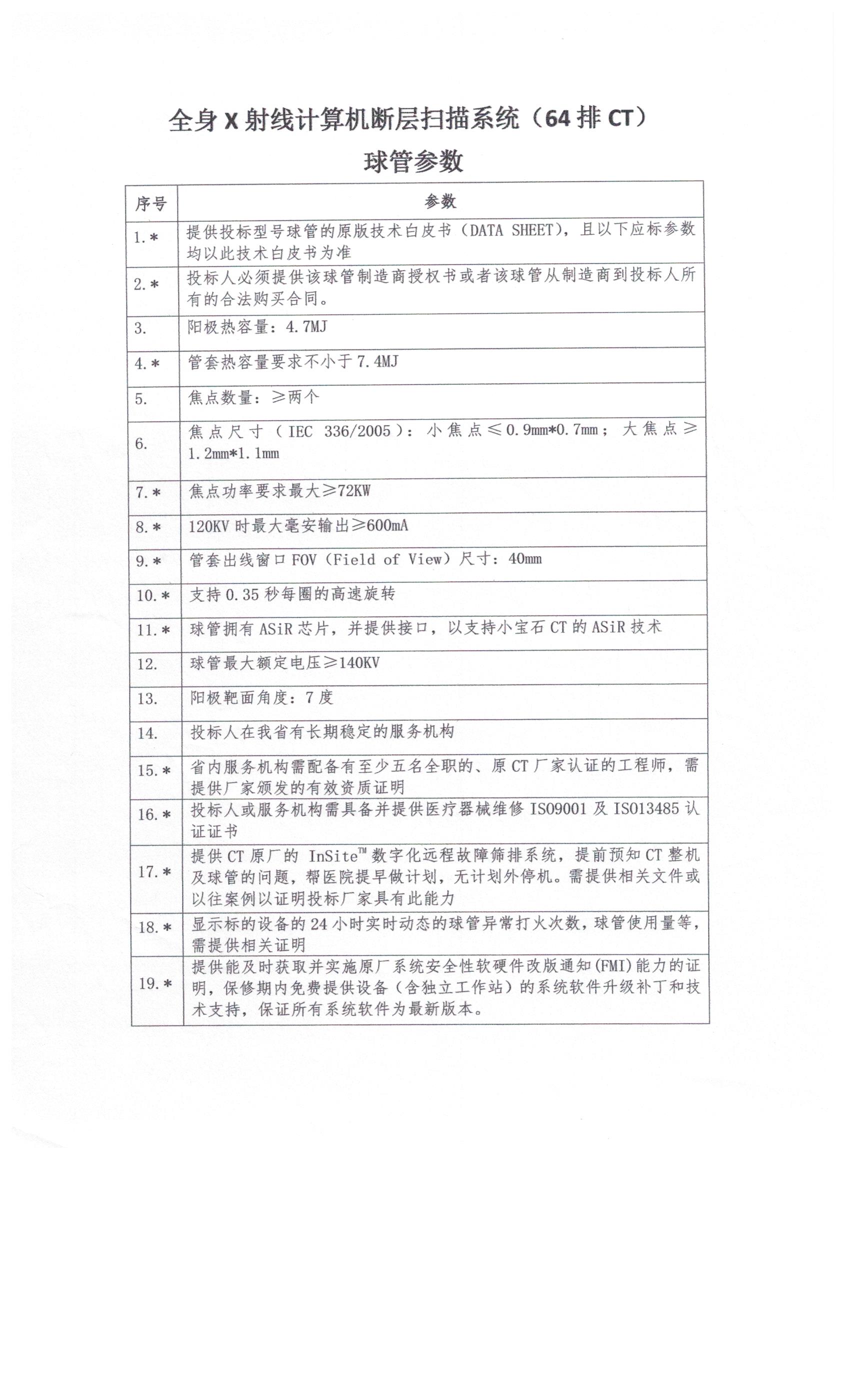 | 为了提高就医质量,方便广大患者,保证就医安全,我院急需全身*射线计算机断层扫描系统(**排**)球管*个。 | ||||||||||||||||||||||||