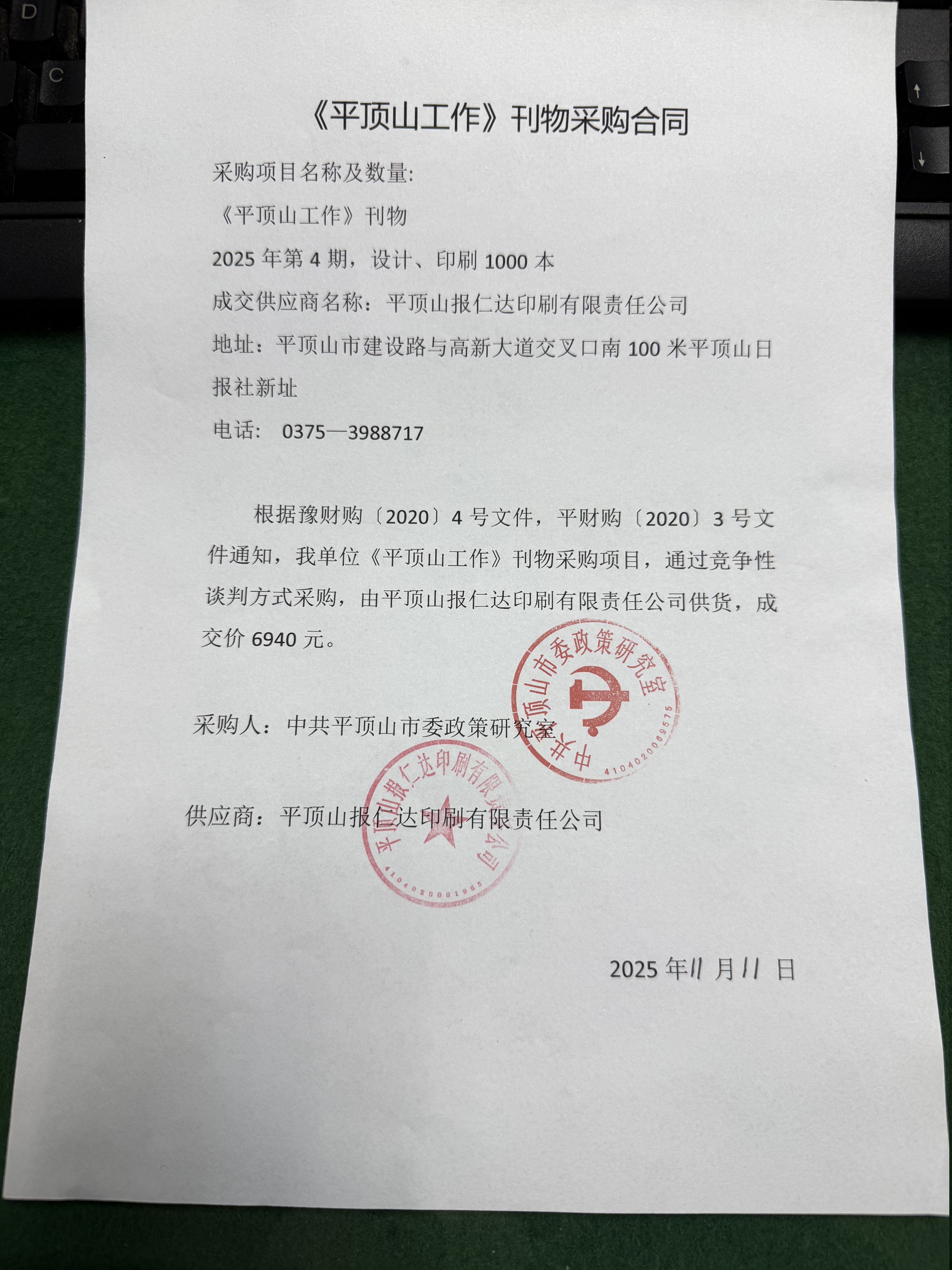 | 二、合同名称:中共平顶山市委政策研究室党刊《平顶山工作》****年第四期印刷 | ||||||||||||