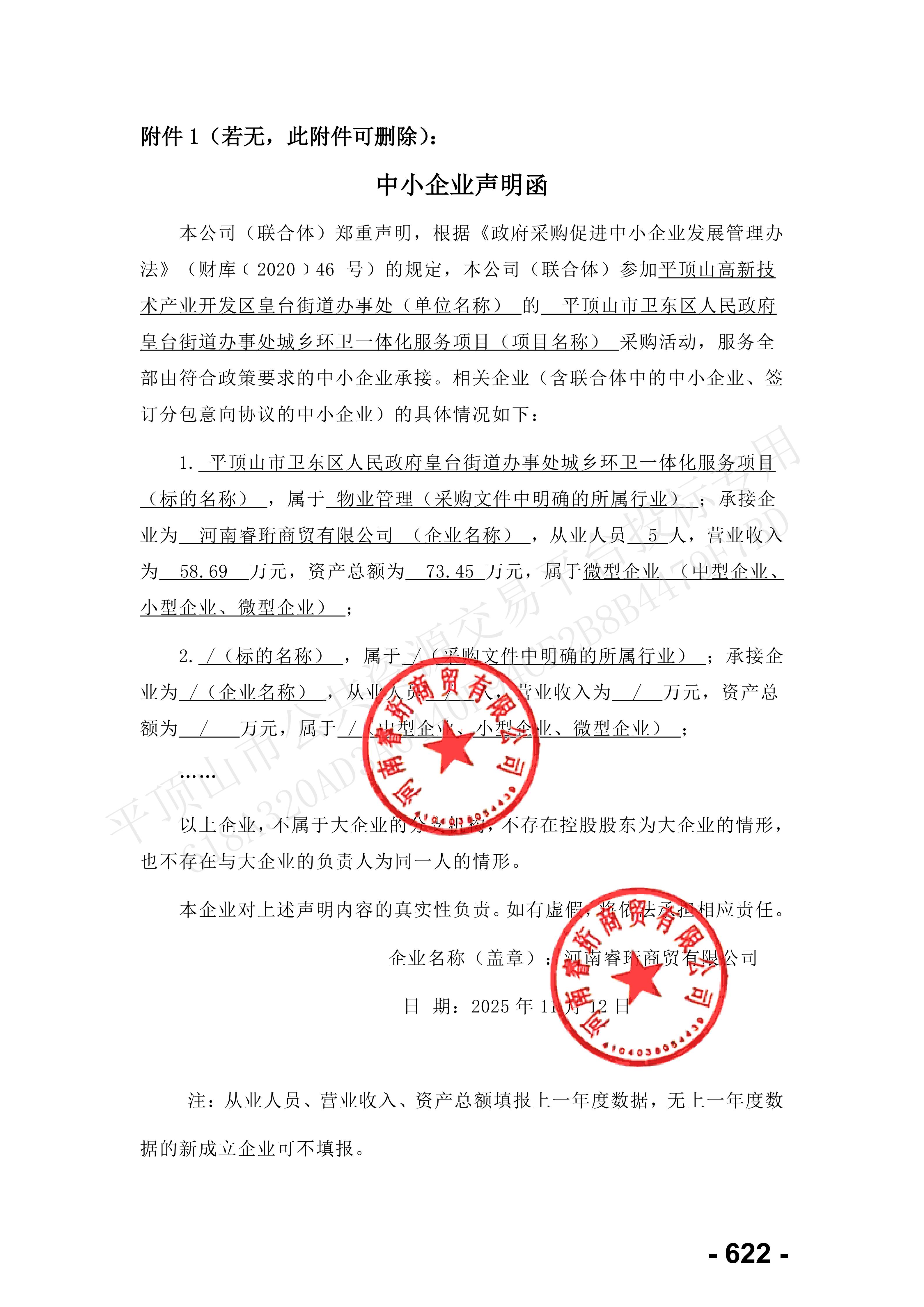 | *、服务内容:本项目服务范围主要包括平顶山高新技术产业开发区皇台街道办事处所辖*个行政村区域内的国、省、县道路,河道、沟渠、池塘,拆迁区域,及村庄所有道路(含绿化带)等,服务内容主要是生活垃圾、建筑垃圾、秸秆、杂草、杂物、树枝藤蔓清运及小广告清理等环境卫生整治工作。 *、服务期限:自合同约定服务起始之日起*年。 *、服务要求:符合现行国家、行业规定的相关标准及采购人要求。 *、合同履行期限:同服务期限 | |||||||||||||||||||||||||||||||
