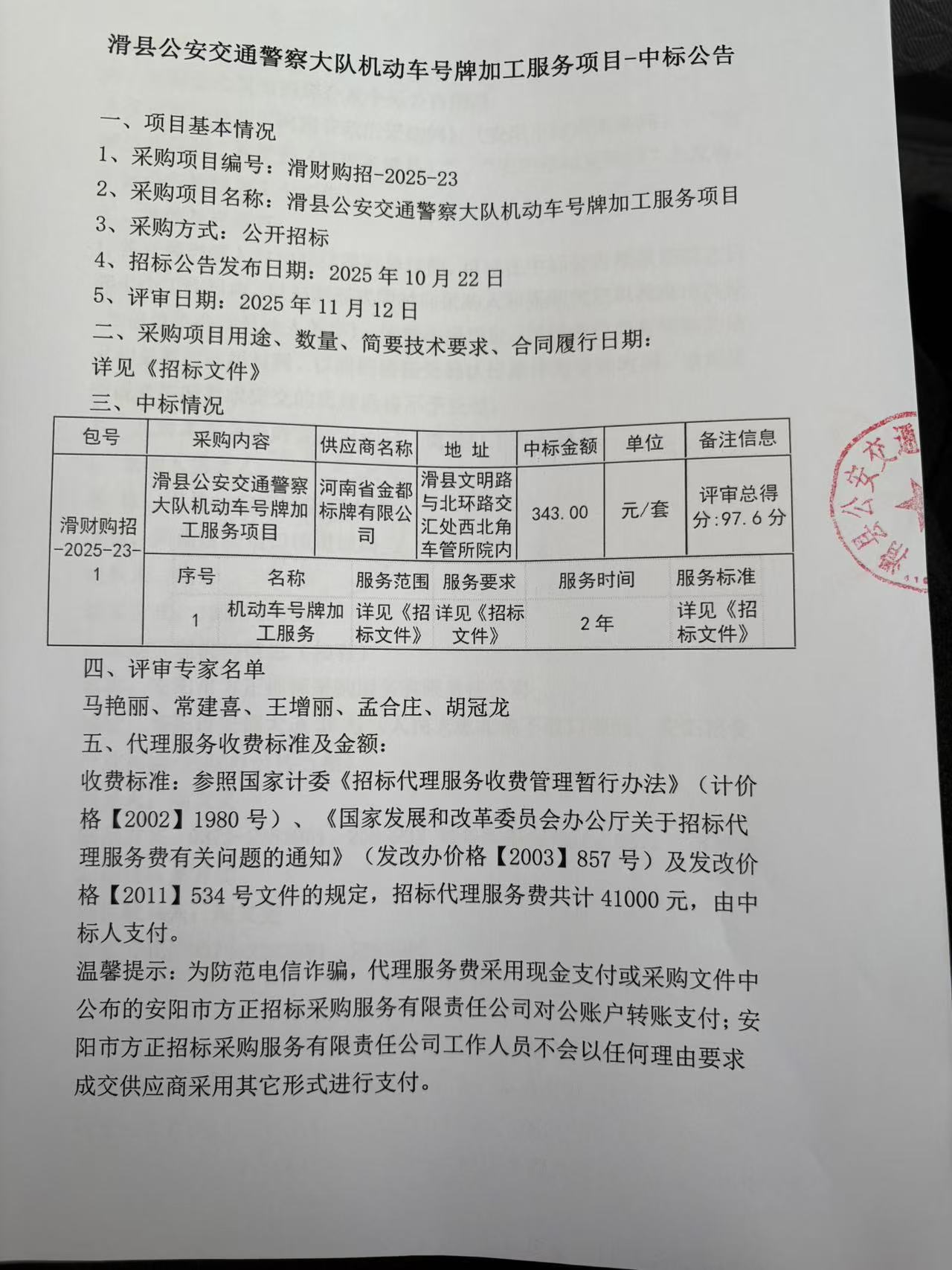 滑县公安交通警察大队机动车号牌加工服务项目-中标公告