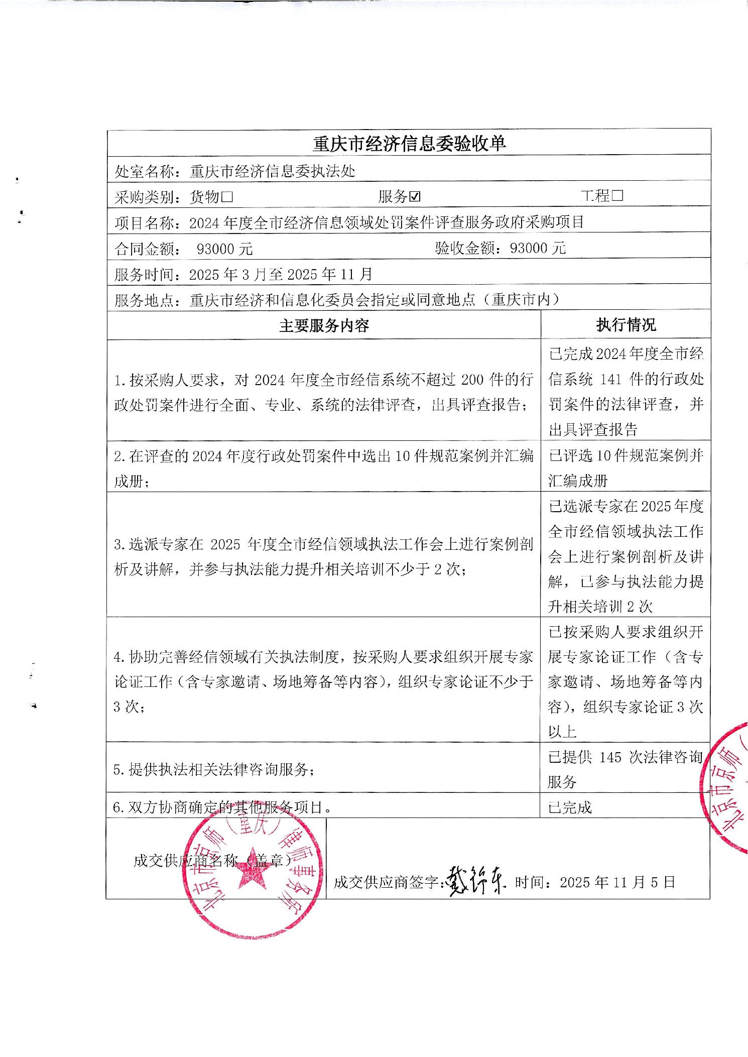服务内容:*.乙方按甲方要求对****年度全市经信系统不超过***件处罚案件进行全面、专业、系统的法律评查,出具评查报告;*.乙方在评查的****年度处罚案件中选出**件规范案例并汇编成册;*.选派专家在****年度全市经信领域执法工作会上进行案例剖析及讲解,并参与执法能力提升相关培训不少于*次;*.协助完善经信领域有关执法制度,按采购人要求组织开展专家论证工作(含专家邀请、场地筹备等内容),组织专家论证不少于*次;*.提供执法相关法律咨询服务;*.双方协商确定的其他服务项目。
