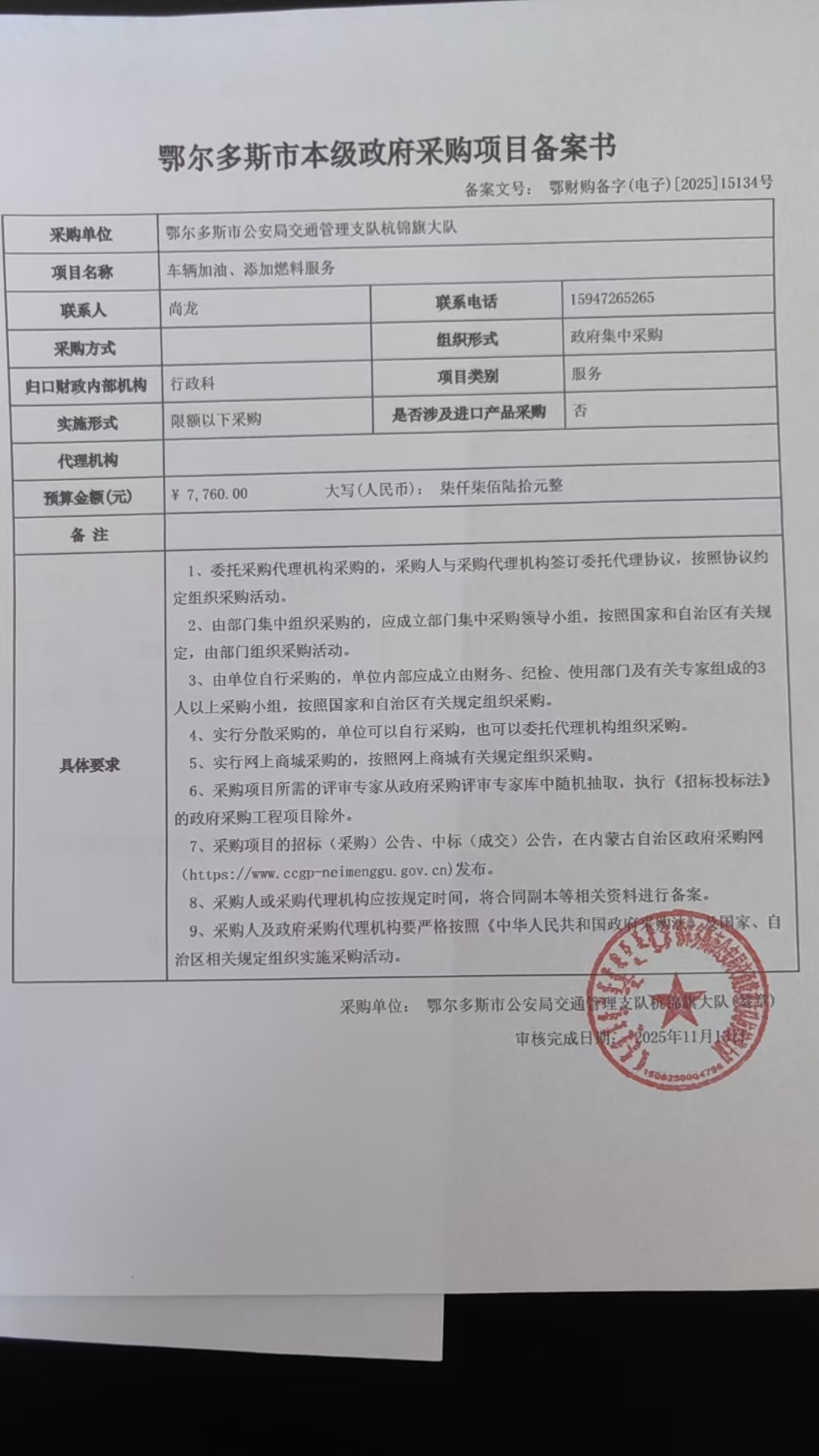 鄂尔多斯市公安局交通管理支队杭锦旗大队独贵中队油燃费政府采购合同公告