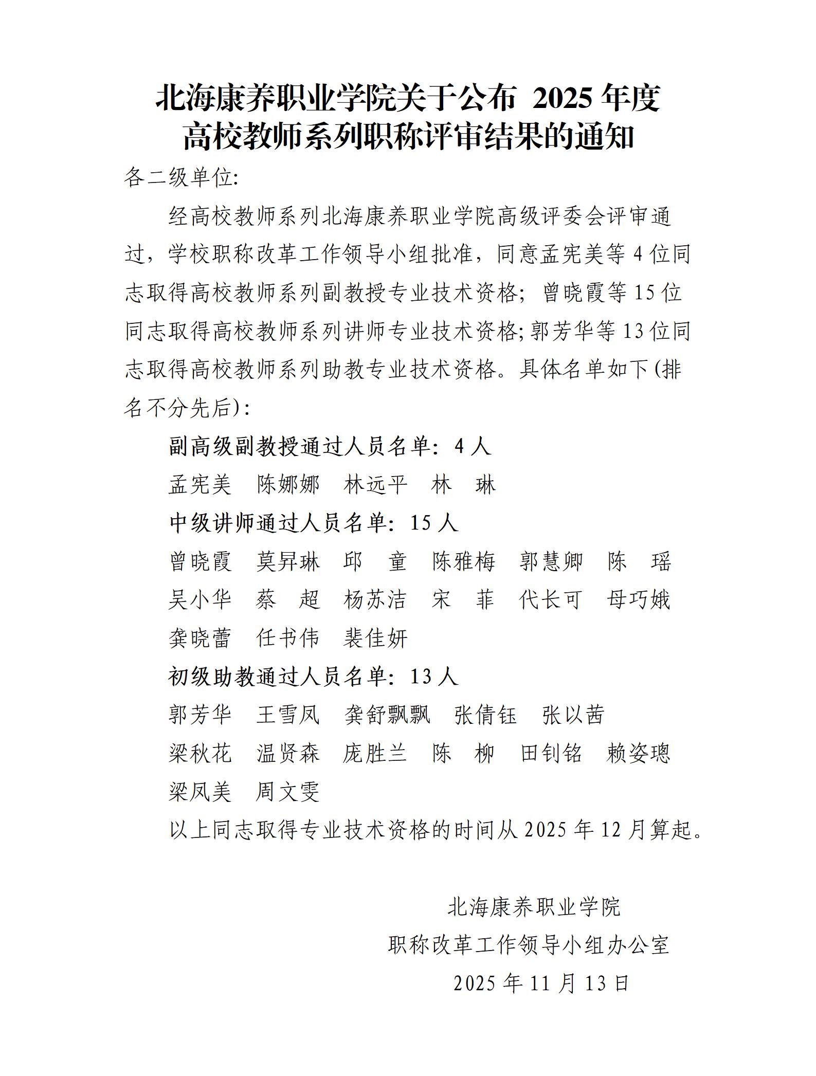 北海康养职业学院关于公布2025年度高校教师系列职称评审结果的通知