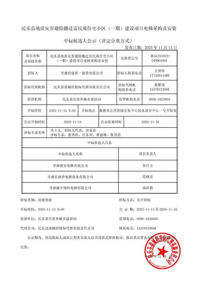 [民乐县]民乐县地质灾害避险搬迁富民苑住宅小区(一期)建设项目电梯采购及安装中标候选人公示交易结果公示