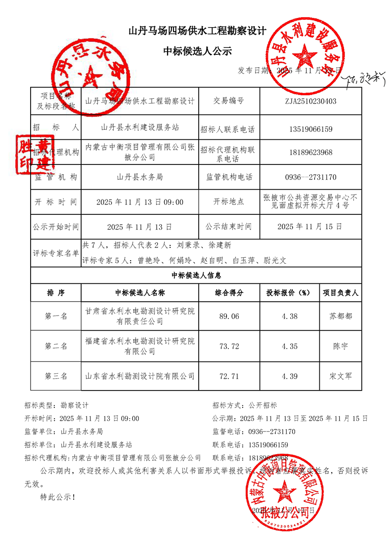 [市本级]山丹马场四场供水工程勘察设计中标候选人公示交易结果公示
