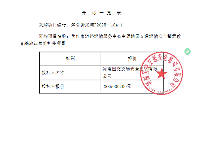 焦作市道路运输服务中心中原地区交通运输安全警示教育基地运营维护费项目-中标公告