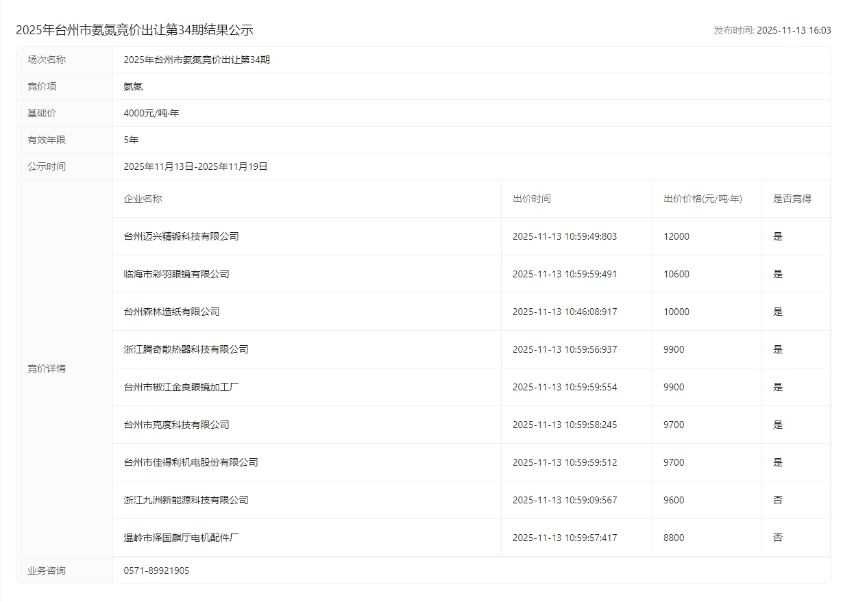 2025年台州市氨氮竞价出让第34期结果公示