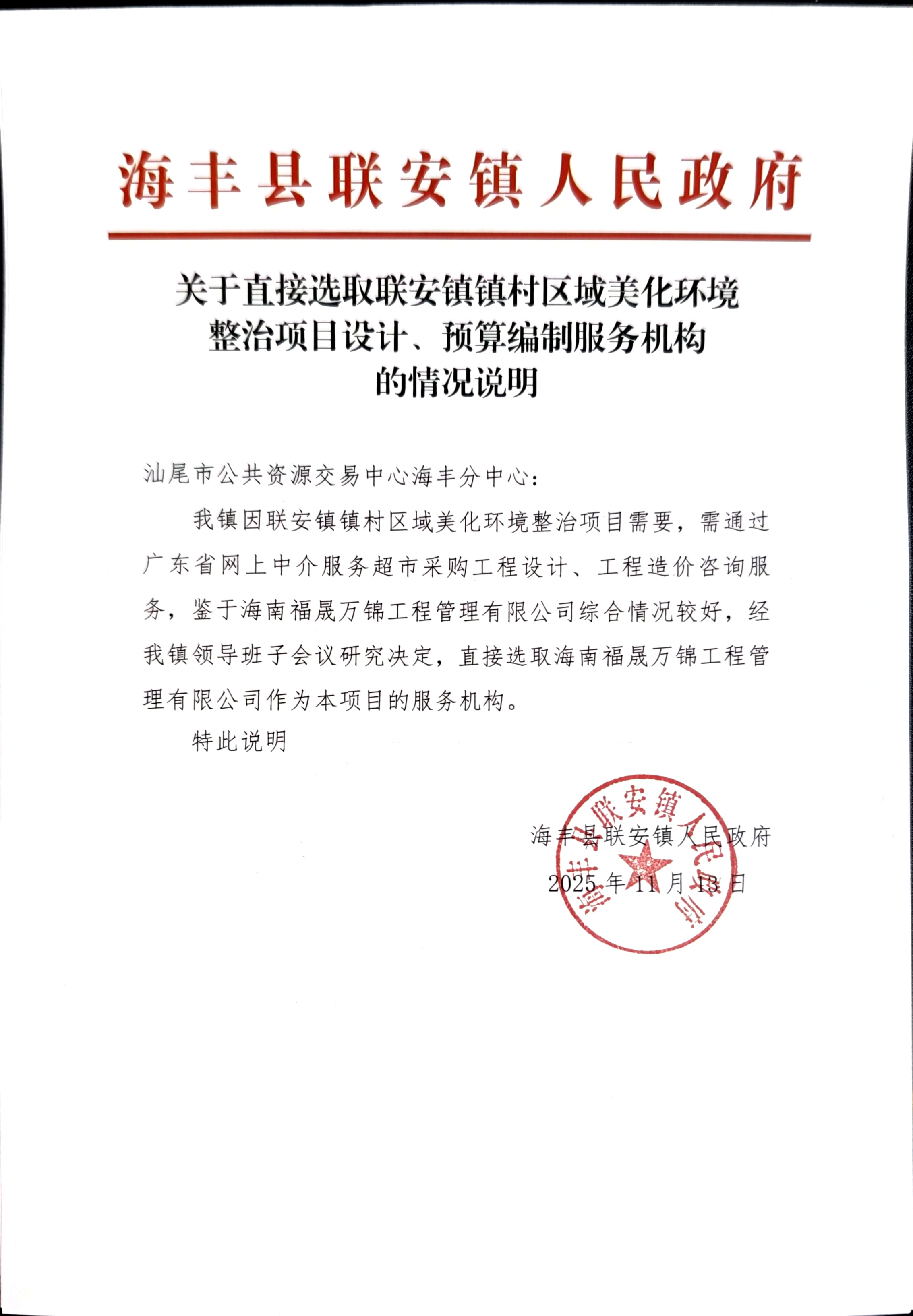 鉴于海南福晟万锦工程管理有限公司综合情况较好,经我镇领导班子会议研究决定,直接选取海南福晟万锦工程管理有限公司作为本项目的服务机构。