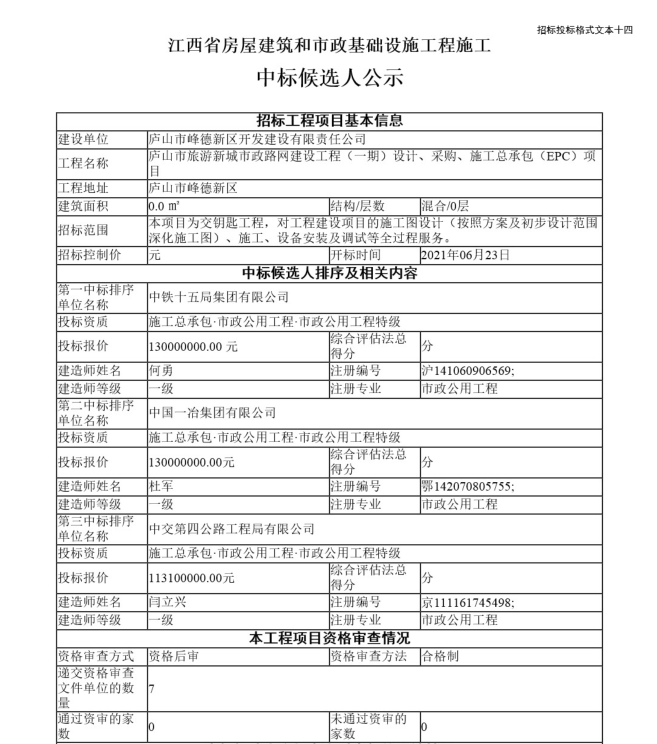 庐山市旅游新城市政路网建设工程(一期)设计、采购、施工总承包(EPC)项目中标排序